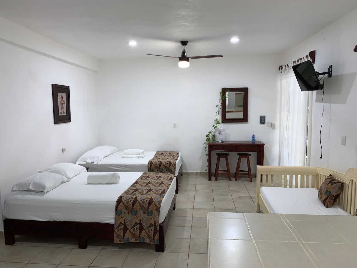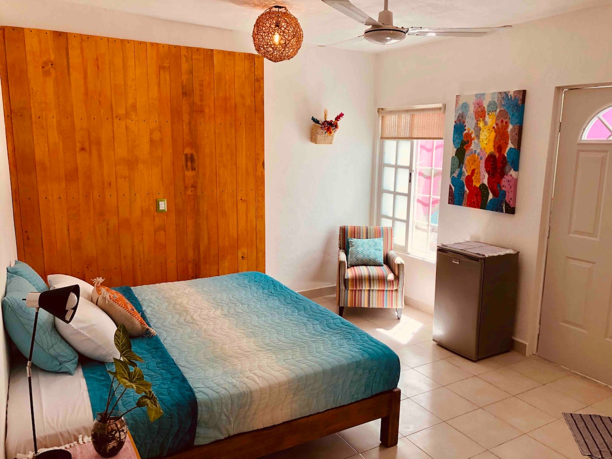 Independent ground-floor studio with all the comforts you need to enjoy Cozumel. It features a king-size bed, air conditioning, a fully equipped kitchen, a small table, a mini-fridge, a private bathroom with hot and cold water (heated by a solar water heater), and free Wi-Fi. Ideally located for saving on transportation, as restaurants, bars, and services are just steps away. On weekends, you can expect a lively urban atmosphere until around 1:30 a.m.