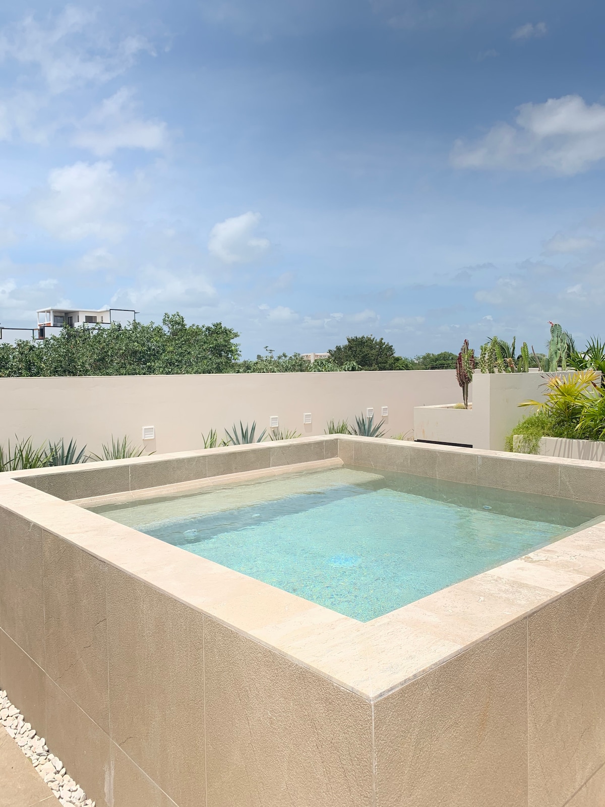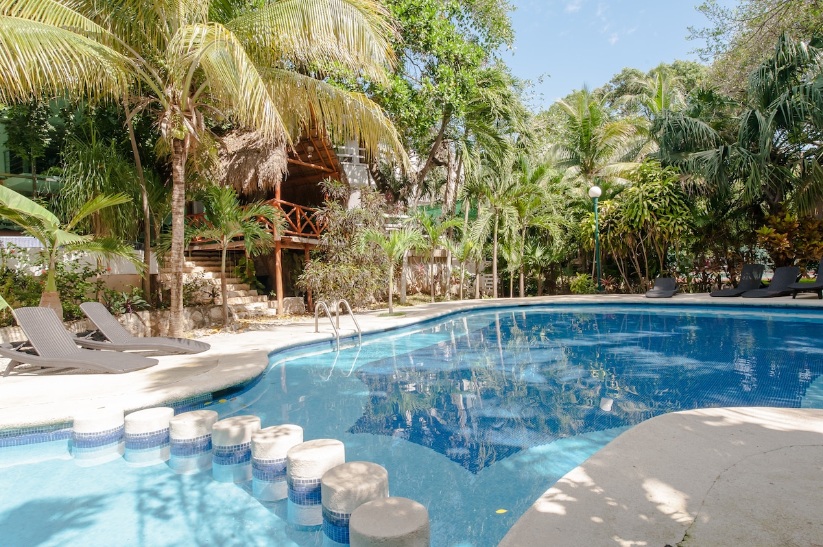 Spacious and comfortable Mexican colonial-style studio with fully equipped kitchen, 1 bathroom, satellite TV, and Wi-Fi. Relax in the cenote-style pool, enjoy another pool with palapa, chairs, and loungers, play on the tennis court, and take advantage of private beach access just 1 minute away. Perfect for couples, solo travelers, business travelers, or those seeking rest, combining comfort, exclusivity, and the best location in Playa del Carmen.