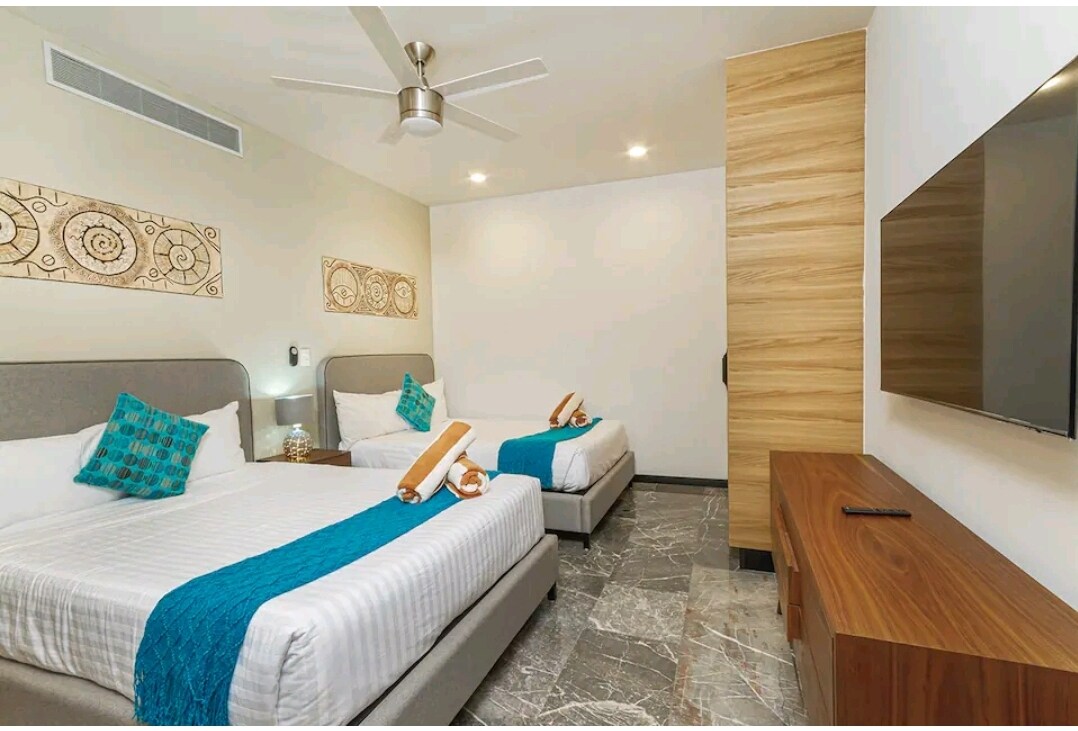 On the Beach, and close to Everything! But this "lockoff" unit does NOT have a view or balcony. Two beds, Bath, TV, WiFi and best rooftop views in Playa del Carmen. (Also listed on airbnb is the front unit with full ocean views and balcony... https://www.airbnb.com/rooms/833317809828568097?viralityEntryPoint=1&s=76 NOTE: beach vibe with music. On unpredictable occasions the beach club hosts raves. Check water level, at times can be directly up to building limiting direct beach access.