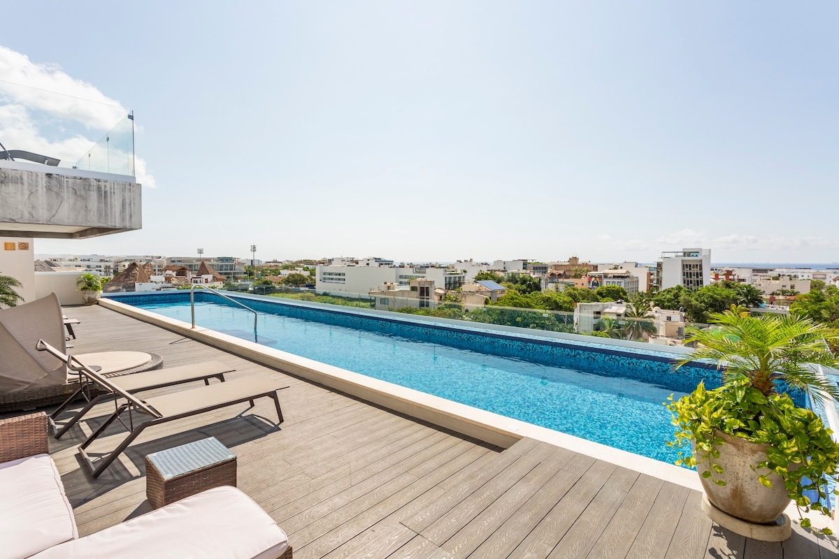 Luxury one bedroom condo with private terrace and plunge pool . Modern space fully equiped to ensure a comfortable and relaxing stay in Playa. Enjoy also common amenities including pool, gym and business center. Exclusivo departamento de una recamara con terraza y alberca privada. Espacio moderno completamente equipado para asegurar una estadía cómoda y relajante en Playa. Disfruta también areas comunes incluyendo piscina ,gimnasio y business center.