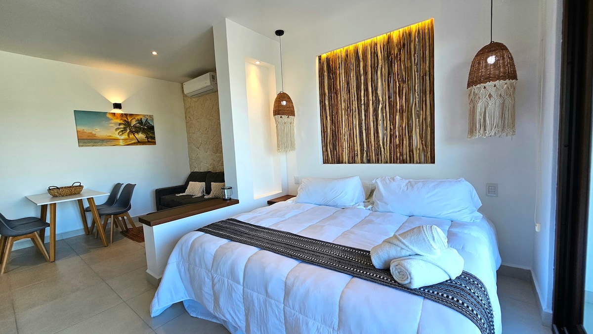 Professionally-designed modern and comfortable suite with a location second to none. The beautiful white sands and crystal clear warm waters of the Riviera Maya are steps away. The famous 5th Ave. Shopping District is one block away with everything you would ever need. Bikes are included so you can enjoy a short ride to many beaches. After a day of adventure, enjoy your luxury suite, private balcony with city and ocean views or enjoy the rooftop pool with panoramic 360 degree views.