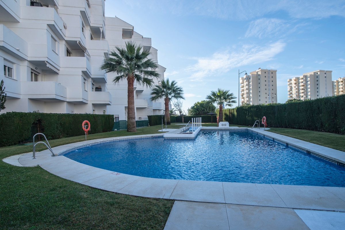 1 bedroom apartment on the third floor, with elevator access. Consists of living room/kitchen, bedroom, bathroom and balcony. Bed, sofa/sleeping couch was purchased new in 2025. The apartment offers accommodation with a seasonal outdoor pool, free WiFi, TV and air-condition in both living room and bedroom. You can park inside the urbanization, but you do not have a reserved space. Quiet neighborhood, close to bars, restaurants, bus stops, taxi, etc. Just 300m to the beach
