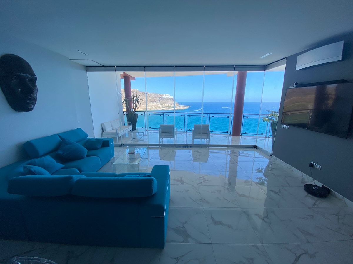 Ocean view The full size terrace window in the leaving room looking at the ocean with the peace fully floating boats on it.Straight after modern renovation! New kitchen,new household, electronic equipment, 2AirCondit, 600mb, Dishwasher, 3 TV-75" 4k in every room.2 HEATED Pools (1 for children). Large Balcony. Private Parking,2Elevator with the OceanView. Suitable for people with disabilities. WE GIVE ADDITIONAL DISCOUNTS FOR STAYS OVER 21 DAYS... See all 98 of our reviews !