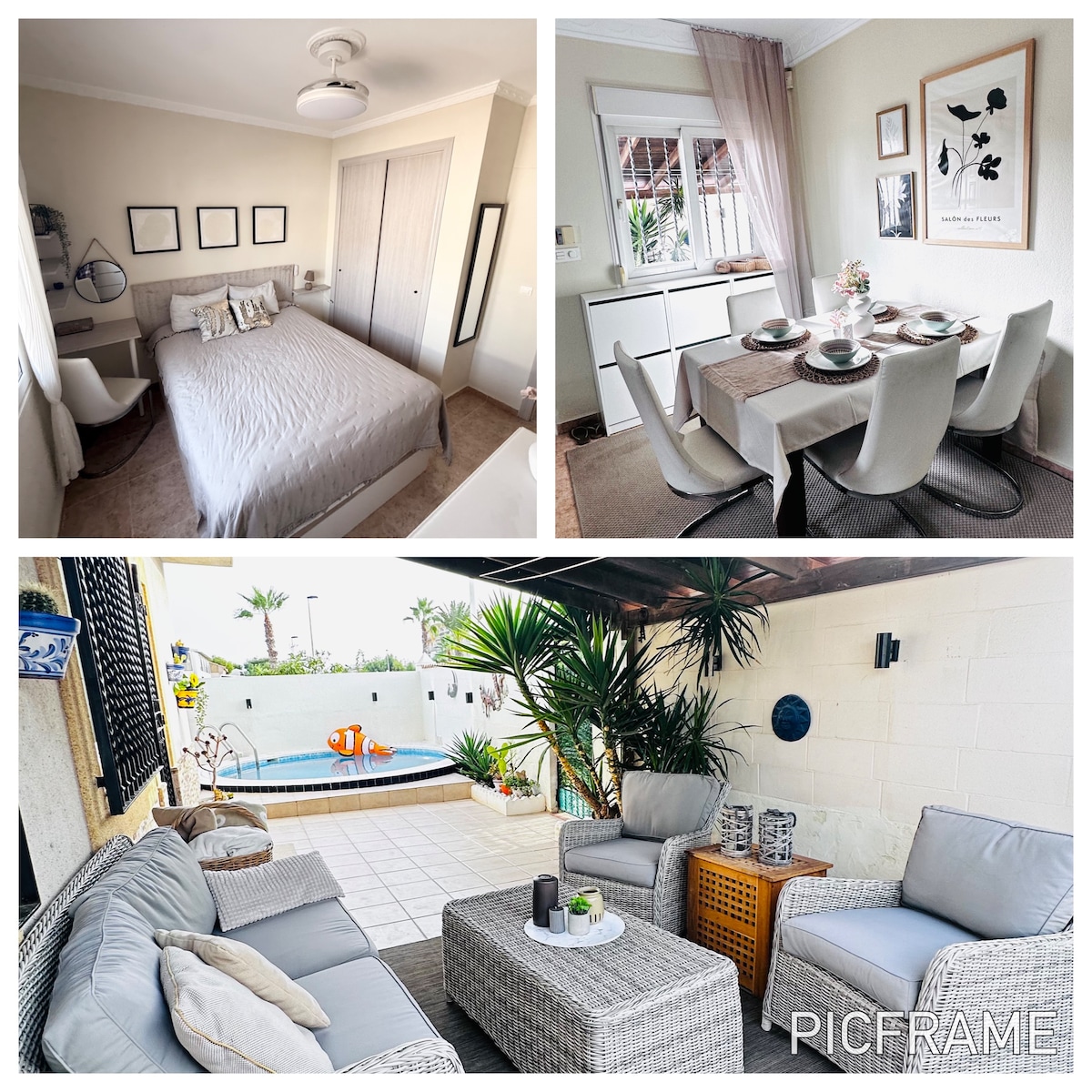 La casa es tipo solárium de unos 60mq , esta construida en la primera planta con 2 cuartos de dormir , salón , cocina , baño , terraza ,TV , Pool ( Piscina ) Privado , WiFFI , A/A .Estamos a 5km del centro de Torrevieja y a esa misma distancia está la playa y a 1km las salinas o mar rojo rico en jodo para curas de la piel y al otro lado el lago y paraje natural de Torrevieja la Mata para senderismo y a unos 150 metros bares , restaurantes , tiendas y Parada de Autobús .etc,etc.