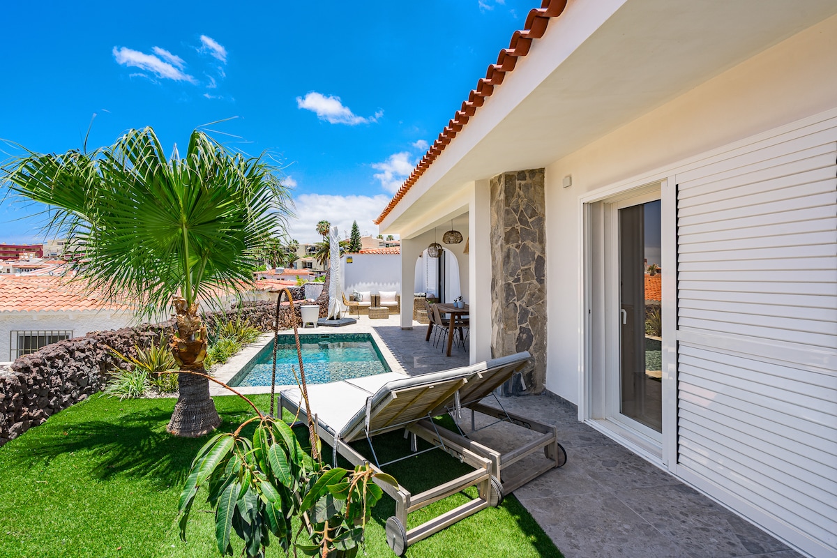 Beautiful modern house! 3 bedrooms, 3 bathrooms, one WC, very big terrace with private heated pool and gardens, magnificent views to the ocean. It is situated just in 7 min walking from the famous Siam Park and a new shopping center Siam Mall. The heating of the swimming pool is 150 euros per a week. We have outdoor camera for security. we´re responsible for ensuring that our listing is safe and compliant with safety regulations.