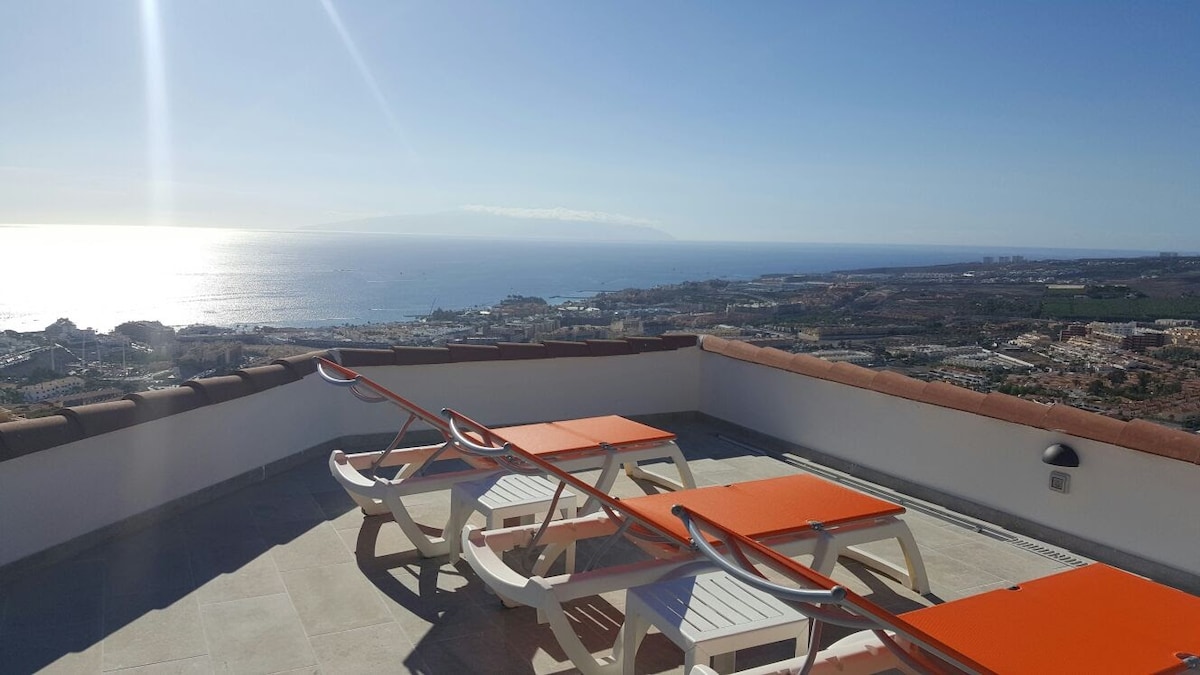 Enjoy my cozy 1-bedroom apartment, featuring a stunning 15m2 terrace with panoramic sunset views over the ocean and La Gomera. My @OceanHomeaway ensures a perfect holiday or extended (working) stay with amenities like fast Wifi, a 50" TV (with Netflix), washing machine, and well-equipped kitchen. Located in a quiet residence with a new swimming pool and easy access to the city center of Costa Adeje, sandy beaches, restaurants, and shopping centers. Ideal for those seeking a relaxing stay.