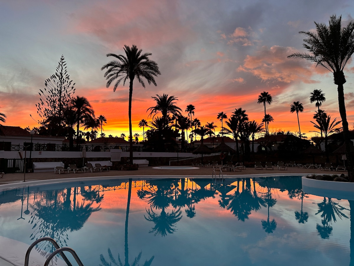 Bungalow is located in Maspalomas, near the famous dunes. The complex has pool, pool bar, supermarket (opened everyday). The bungalow offers WIFI, smart TV, and everything you need for your stay ( beach towel, hair dryer, gel, champu, iron... The kitchen is very well equipped: kettle, coffee machine, microwave, fryingpan, saucepan, pot, toaster, etc. 2 BIKES are offered FOR FREE!! The famous beach of Mapalomas and the light- house are 5 minutes by bike far away from the bungalow.