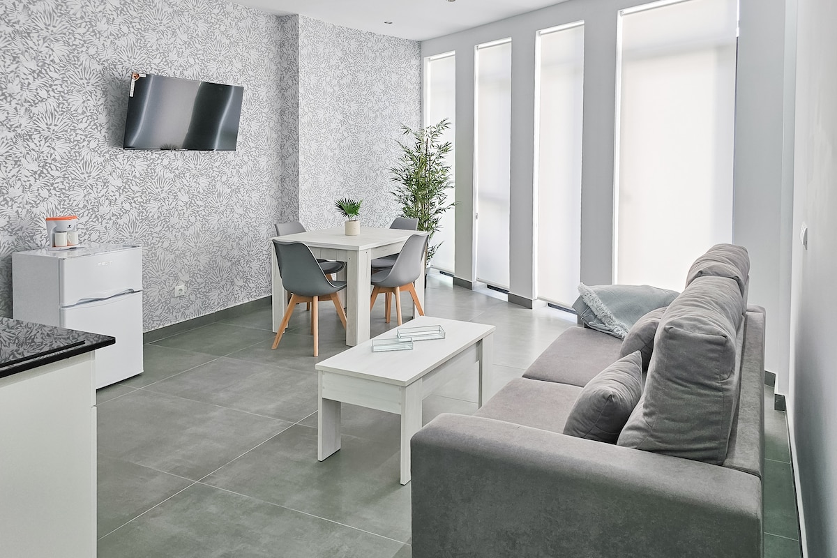Moderno apartamento de un dormitorio con 1 cama matrimonial de 150cm, Baño privado con ducha, lavabo, secador de pelo y amenities. El salón dispone de un sofá cama de 1,35m, mesa de comedor con cuatro sillas, cocina equipada con vitroceramica, horno, nevera, menaje, microondas, tostadora, hervidor de agua y cafetera. Servicio desayuno de 8:00h a 10:30h en nuestra TERRAZA de Hotel LA MILAGROSA (bajo el suplemento).