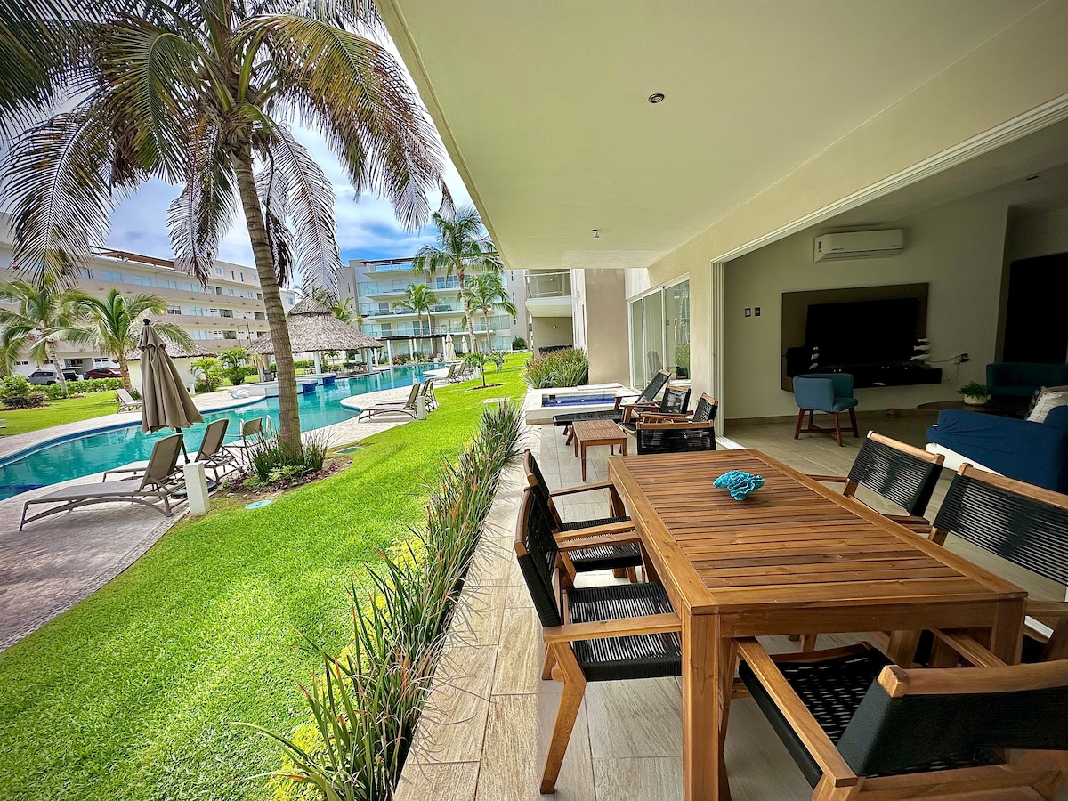 Lujoso, moderno y amplio departamento al pie del mar con vista espectacular de la bahía. El condominio tiene acceso directo a la playa, una zona de alberca con jardin, wifi gratuito en áreas comunes, sundeck y playa privada ! Ambiente relajado y familiar, seguridad las 24h y un personal muy amable y eficiente. Excelente ubicación, a un paso del club de golf, muchas opciones de restaurantes y supermercado cercanos. No se aceptan mascotas.