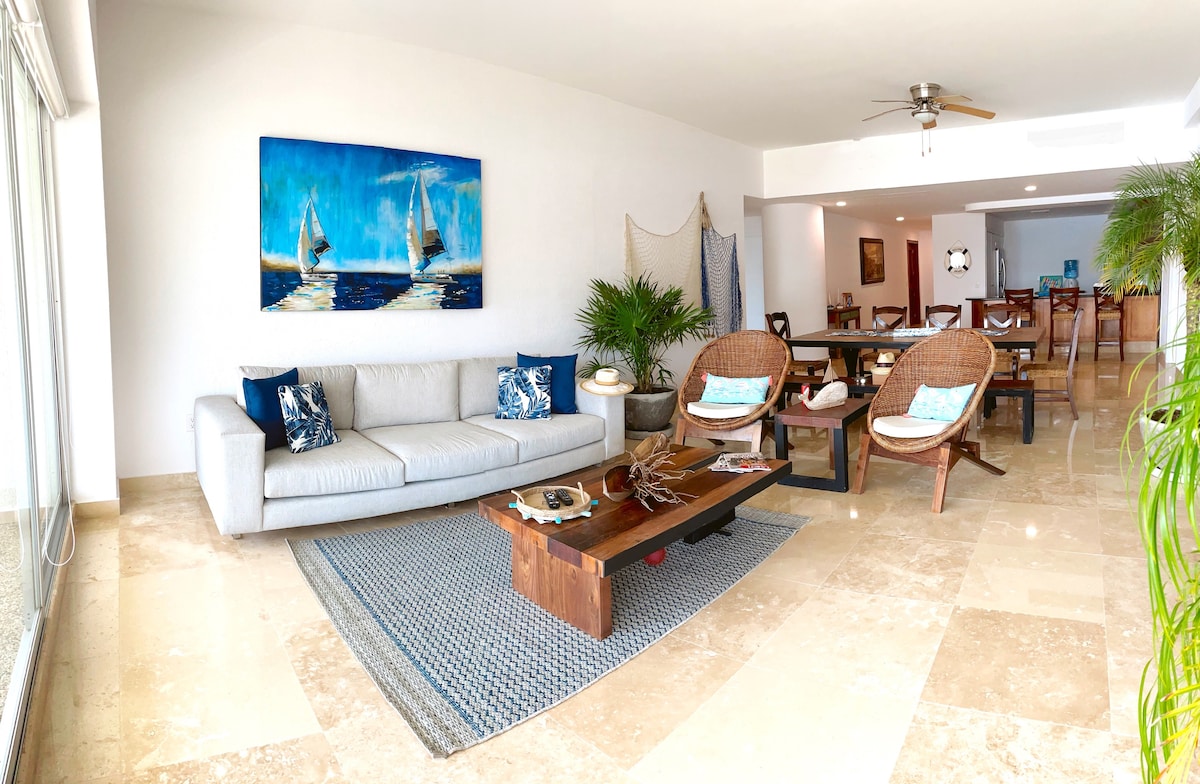 Modern and comfortable apartment in the heart of the Mexican Pacific, ideal for families or groups seeking rest, fun, and luxury in Acapulco Diamante. With 3 bedrooms and 3 full bathrooms, it accommodates up to 6 adults and 2 children. The stay includes a fully equipped kitchen, a balcony with partial ocean view, and all the comforts to make you feel at home. Views of gardens, palm trees, and pools within one of the most exclusive residentials in the area. Includes 2 parking spaces.