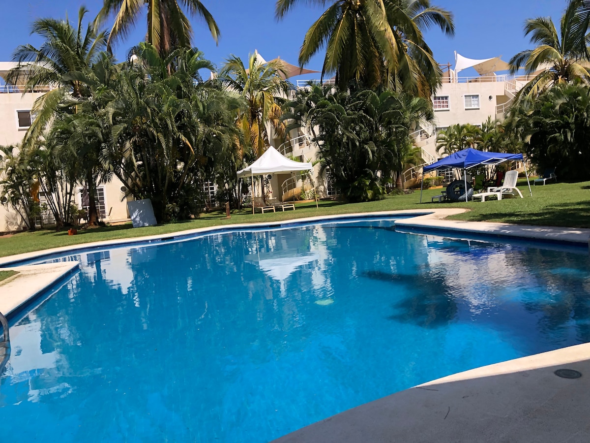 🌴🌊 Vive de Acapulco Diamante en un depa amplio dentro de Mayan Lakes, un paraíso rodeado de albercas, lagos y jardines tropicales. ❄️🛏️ Relájate en nuestras 4 frescas habitaciones con A/C para hasta 8 personas, ideal para familias y grupos que buscan comodidad y espacio. 🏖️🌞 Disfruta nuestras amenidades tipo resort: 🔸Casa Club con sauna, vapor, gym, restaurante y canchas de tenis, pádel, futbol y vóley. 🔸Club de Playa a 6 minutos en coche, con albercas y acceso a una hermosa playa.