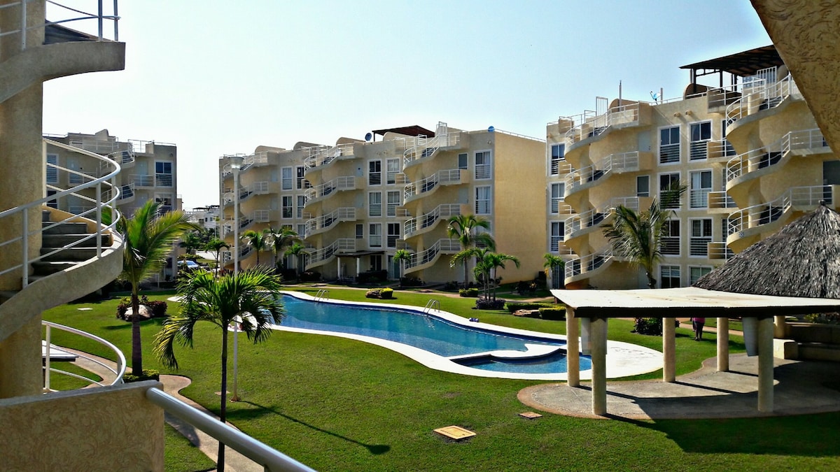 Increíble departamento en Acapulco Diamante, en el Fracc. Puente del Mar, a unos pasos de Playa Bonfil. Todos los servicios, albercas y áreas comunes funcionando al 100% . Ideal para parejas, familias, viajeros solitarios y/o de negocios. Está a unos pasos de la alberca y cuenta con una terraza privada con camastros y accesorios para que puedas asolearte o comer relajándote. La playa ya está acondicionada y en funcionamiento; hay área de Palapas así como oxxos, tiendas y restaurantes muy cerca.