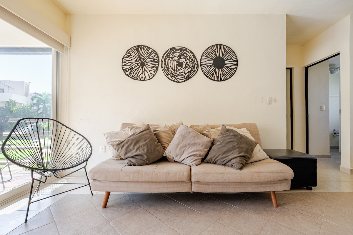 ATENCION, NO TUVIMOS NINGUN DAÑO POR JOHN!!! Aqui encontraras todos los servicios necesarios para disfrutar y descansar, contamos con cocina completamente equipada, 2 habitaciones, 2 baños, sala, wifi, elevador, alberca olimpica, jacuzzis, estacionamiento para varios autos y seguridad 24 hrs, contamos con club de playa PRIVADO y a la orilla del mar, un supermercado muy bien surtido a 5 minutos y estamos cerca del aeropuerto, en fin todo para que pases unas vacaciones increibles