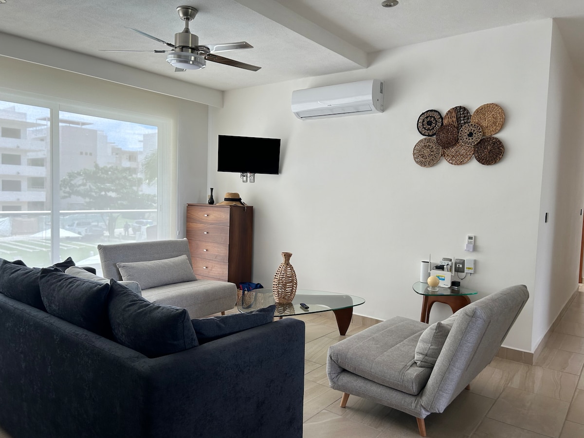 Apartamento de lujo de 1 habitación mas sofa cama.Capacidad para 2 a 5 personas, es importante colocar el número de personas ya que se envía un correo a recepción para el acceso, el condominio tiene todas las comodidades: aire acondicionado, y cocina equipada piscina, playa y terrazas. La hora de entrada para registrarse es de 1pm a 9:30pm,y salida pueden ser flexibles siempre y cuando se coordine con el propietario.