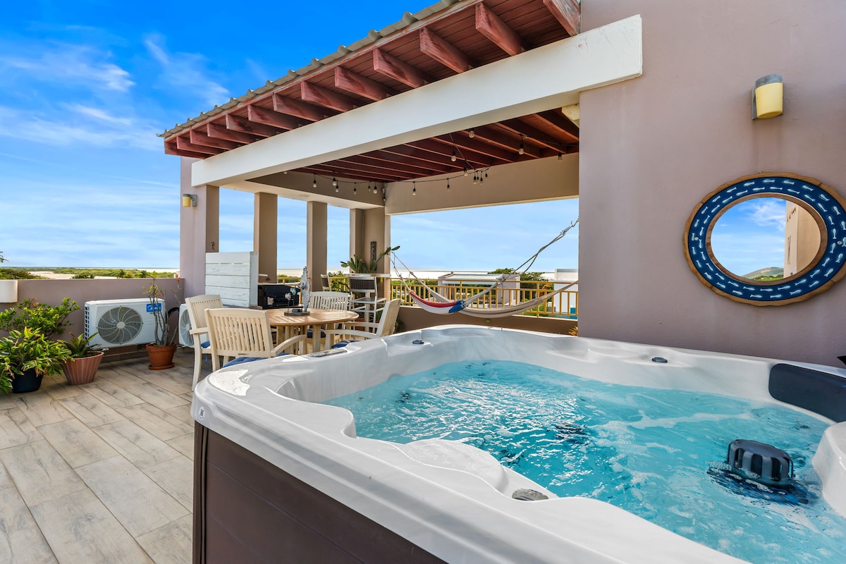 Newly renovated penthouse with three private parking spaces. The master bedroom has a balcony, and the home includes a fully equipped kitchen, smart TVs, and luxury bathrooms. Enjoy 360° views from the rooftop terrace with private hot tub. The property offers a main and children’s pool, basketball court, and playground. Just a five-minute walk to Combate Beach, restaurants, bars, and a public boat ramp.