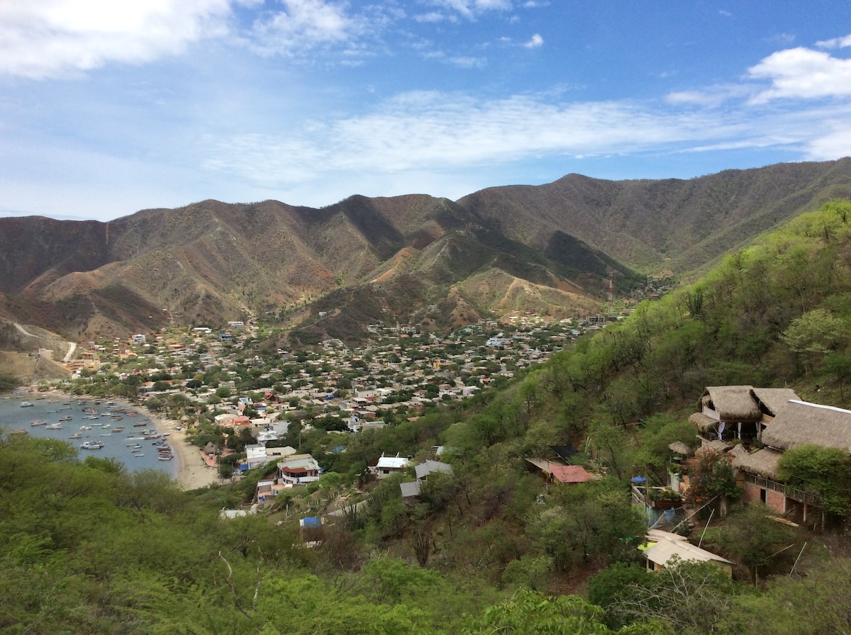 Disfruta tu estadía en Taganga con una maravillosa vista a la bahía rodeado de naturaleza. Apartamento de un espacio en primer piso con baño privado, cocina, sala y aire acondicionado, muy espacioso y super tranquilo, contamos con una terraza común en piso superior con vista. (La habitación no tiene vista directamente al mar) Relájate en este tranquilo lugar lejos del ruido y a 500 metros de la playa, donde puedes disfrutar tu desayuno con una excelente vista al mar.