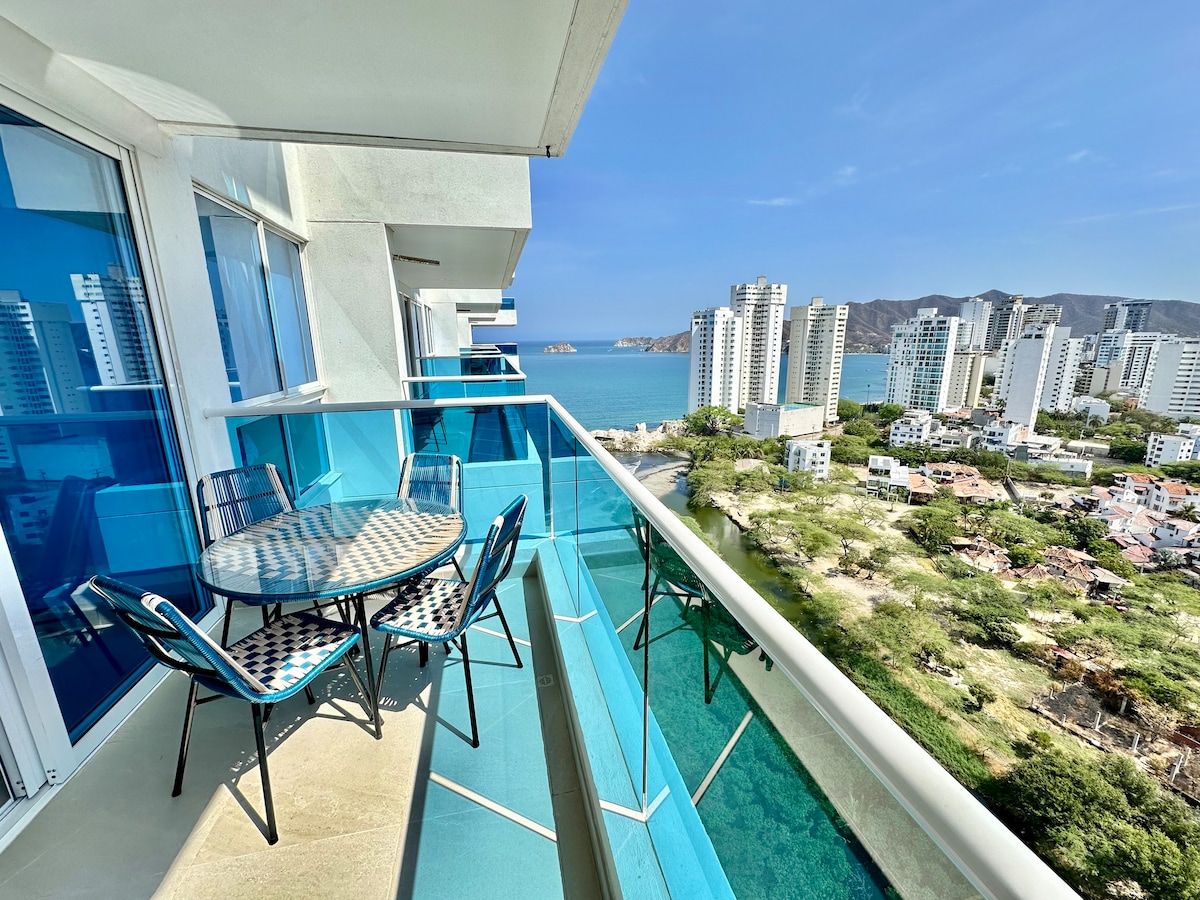 Espectacular apartamento moderno para estrenar en un piso 17 con vista al mar y salida directa a la playa. Espacio agradable para tomar vacaciones, descansar y/o trabajar home office. A 10 minutos del aeropuerto internacional y del centro histórico de Santa Marta, cerca a zona de restaurantes, bares, centros comerciales y farmacias. A menos de una hora del Parque Nacional Tayrona, Taganga, Minca. El apartamento cuenta con un amplio balcón donde podrás disfrutar del mejor atardecer de Colombia.