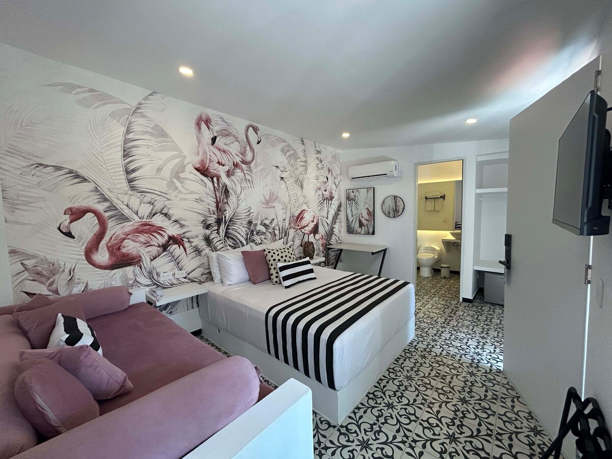 Delight in a contemporary duplex within a boutique hotel in the Historic Center of Santa Marta. This is perfect for three people, with two spacious levels, comfortable beds, air conditioning, and a private bathroom. The hotel has a littlel pool, gym, and is in a great location, just steps from the Cathedral, restaurants, and the most famous places in the colonial center.