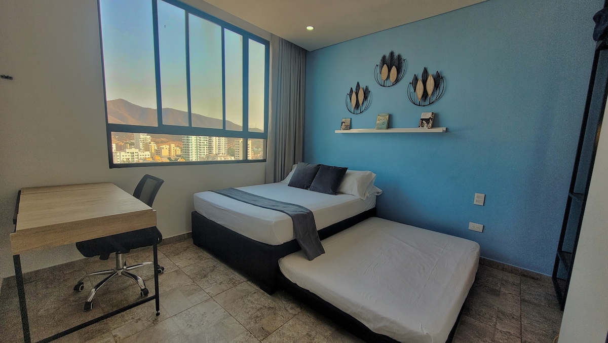 Los pisos altos y bajos estan sujetos a disponibilidad. NO SE PERMITEN VISITAS EN LOS APARTAMENTOS. Area 108m2. Cuenta con escritorio de trabajo con lámpara y silla de trabajo en cada habitación, caja fuerte por habitación, dos baños con amenities como shampoo, acondicionador, shower gel, papel higiénico, Toallas de cuerpo, manos y tapete para pies. Cocina totalmente equipada, zona de labores con lavadora, Tabla de planchar y plancha, balcón, sala, comedor y sofá cama.