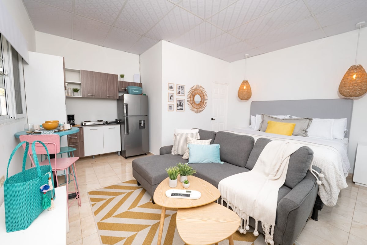 This apart-hotel has 9 apartments. Beautiful ocean view from our deck. Perfect for couples or up to 3 guests. A crib is available upon request. Located on a second row. No front beach Free coffee from 7-11 AM. Snacks & breakfast for sale available at our bar. Apartment features: Sofa bed Queen bed with A/C Desk TV Private bath & shower Living room w A/C Closet Full kitchen Caja fuerte Rates for 2 guests (max 3). Shared amenities: pools, BBQ, bar area and sunbeds.