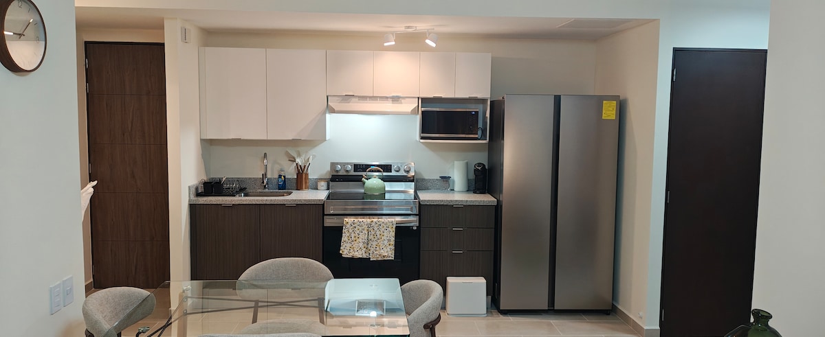 Apartamento muy cómodo, con ambiente relajado y tranquilo, rodeado de naturaleza y un toque de elegancia y confort. Nos encantaría conocieras las ventajas de nuestro maravilloso lugar a 5 minutos de la playa y donde podrás tener acceso a diferentes restaurantes y actividades en el litoral Salvadoreño sobre la carretera Surf City. Sobre el espacio: Es un apartamento ideal para parejas o familias pequeñas. No se permiten fiestas, solo el número de huéspedes indicados en la reservación.