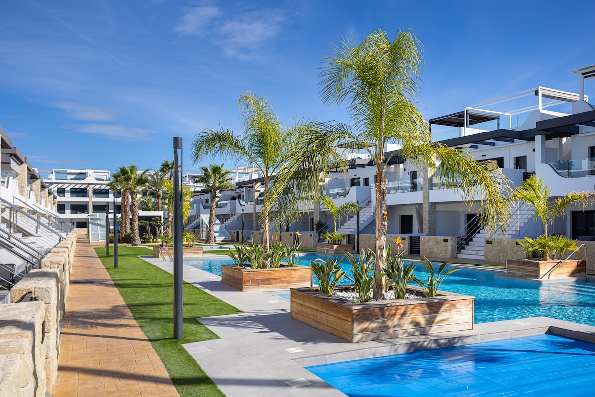 Welcome to Arbequina Apartment in Flamenca Village-just steps from Playa Flamenca, La Zenia Beach, and Flamenca Boulevard outdoor shopping center. This stylish, family-friendly apartment overlooks the courtyard and includes a dedicated secure underground parking spot. Enjoy multiple pools, hot tubs, a gym, a sauna, and a chill-out bar. With beach, shopping, and resort-style amenities all nearby, it's the perfect spot for all ages to relax, explore, and enjoy the Costa Blanca lifestyle.