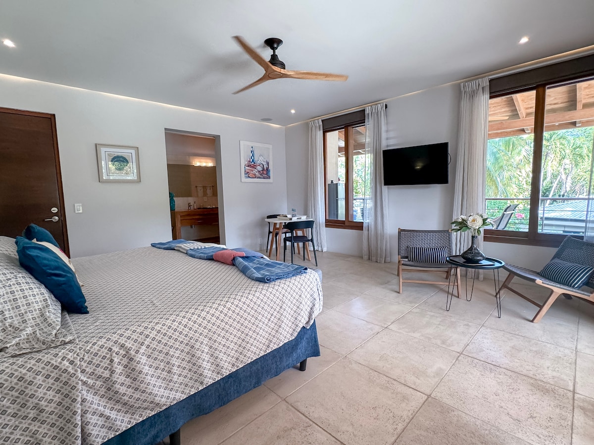 This spacious private retreat features a large outdoor lounge and direct access to a saltwater pool. Surrounded by lush greenery, you’ll feel tucked away in the jungle—yet the beach is just 100 steps from your door! Stroll along the sand and reach Tamarindo’s vibrant shops and restaurants in under 7 minutes. It’s the perfect blend of tropical seclusion and town convenience.