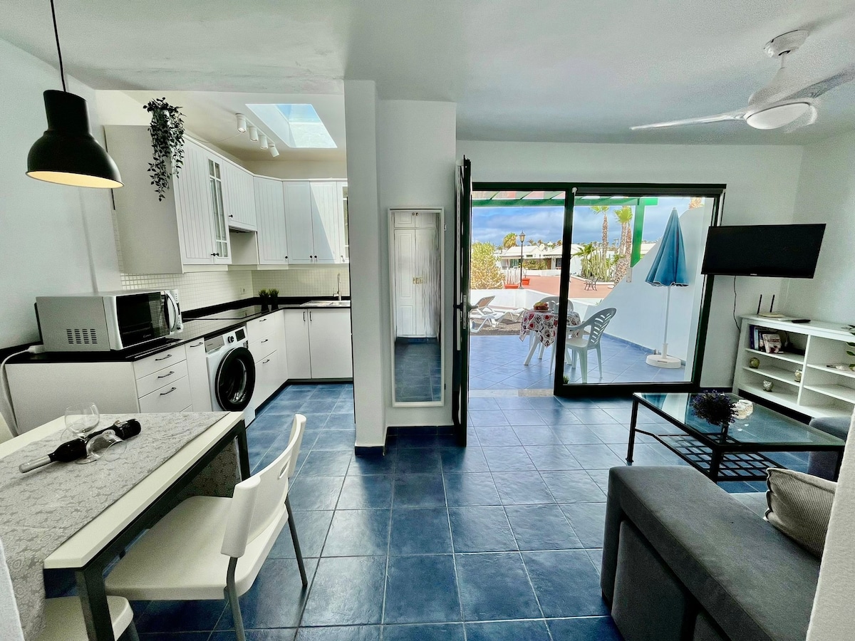 Precioso apartamento con su jardín privado, Ubicado en Montaña Roja en Playa Blanca, consta de un dormitorio con cama de matrimonio y baño completo en suite, cocina equipada con vitro cerámica, horno, microondas, lavavajillas, nevera, lavadora y muchas cosas mas, salon comedor con sofa cama, smart tv, wi-fi. Zona jardín terraza con barbacoa. Esta situado en un residencial muy tranquilo cerca del mar ( 300 metros ), hay 2 supermercados, restaurantes, bares,...