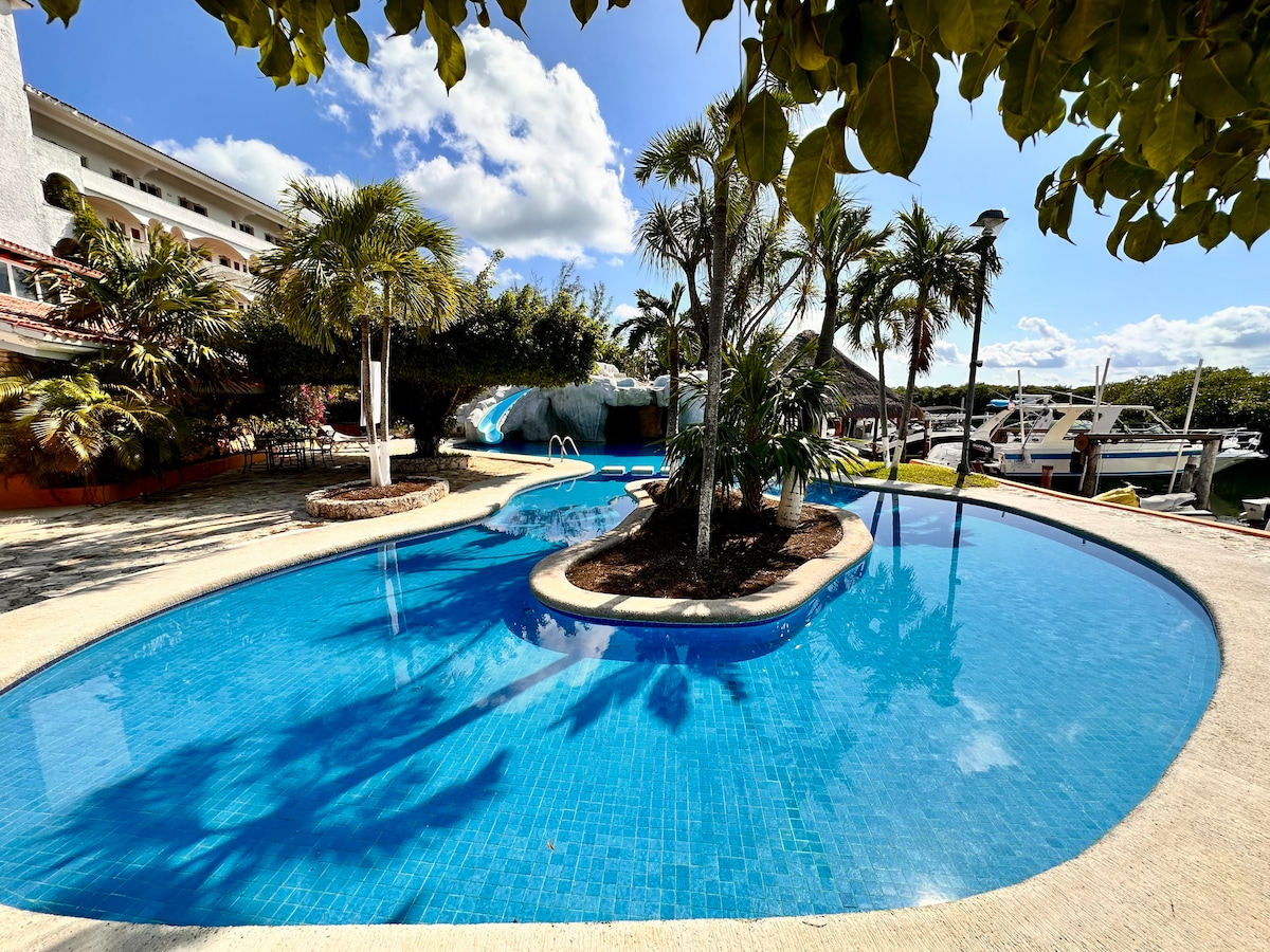 sencillo y agradable departamento vacacional se encuentra en segundo piso. Tiene una cómoda ubicación cerca de playas, Zona de bares antros (10 min en autobús) , farmacias, supermercado, tiendas de conveniencia y casas de cambio. Disfrutarás de una bella y relajante vista hacia una hermosa laguna donde podrás disfrutar de bellos atardeceres. El departamento no cuenta con alberca sin embargo a tan solo 5 min a pie encontrarás la playa con aguas cristalinas tranquilas y de poca profundidad.
