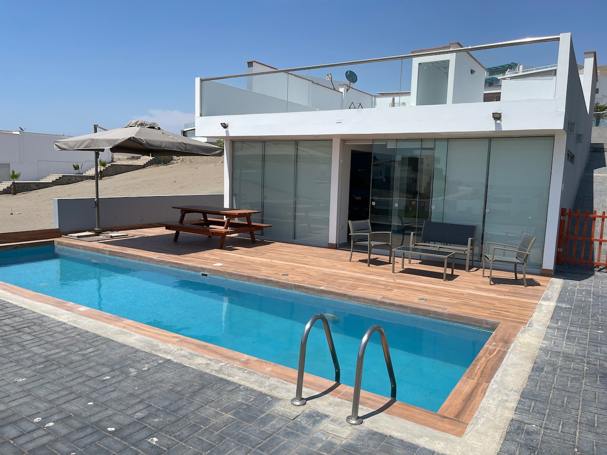🌊 Hermosa casa en primera fila frente al mar, con acceso directo a la playa y una vista espectacular. Ideal para vacacionar en pareja, familia o con amigos. Cuenta con 5 habitaciones, 4 baños completos, piscina privada, zona de parrilla, horno de barro e internet Starlink. Excelente ubicación: a 5 minutos del muelle de Cerro Azul y restaurantes (caminando por la arena a 20 minutos), a 15 minutos de Asia y a 1 hora de Lunahuaná. Espacios amplios y perfectos para el descanso y la convivencia.