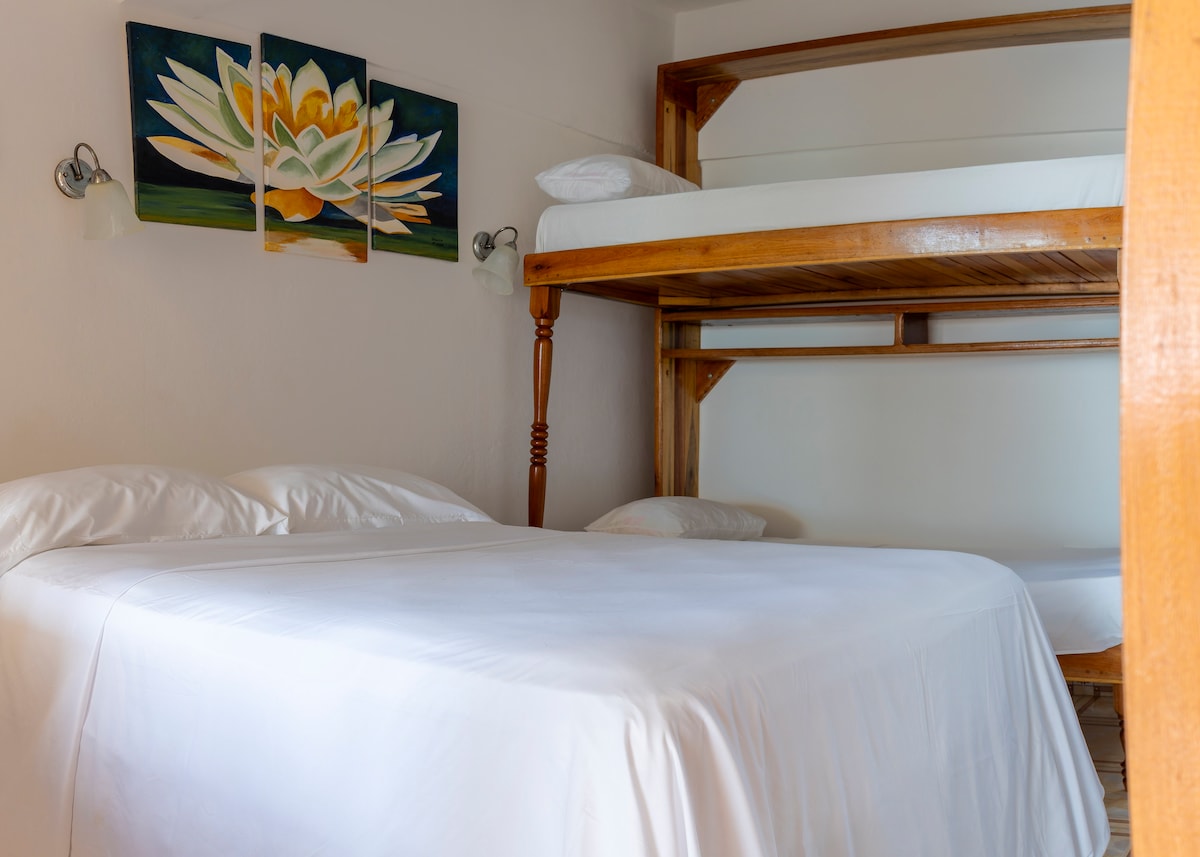 Confortable apartamento con sala, comedor, cocina, habitación climatizada y su baño privado. Junto otra bella habitación climatizada, con entrada independiente y baño privado. Capacidad total para 8 huéspedes, distribuidos en 4 camas dobles. Agua caliente y fría, 110-220, caja fuerte, secador de pelo, lavandería incluida. Servicios extracargo de desayuno, cena, alquiler de bicicletas, y otros. Tenemos wifi y piscina también, y nos encontramos a solo 15 minutos a pie de la playa. Lo esperamos!
