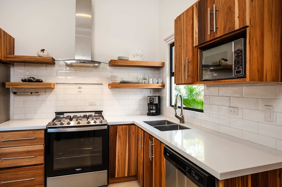 Enjoy a stylish experience at this centrally-located home. Casa Terra, built nestled into the natural jungle of Playa Grande, where you will feel one with nature. Two bedrooms, each with en-suite bathroom and plush, luxurious, comfortable beds to fully rest and recharge. Open, bright kitchen and living room surrounded with large glass doors so you can fully enjoy the view of nature. We really are a just a short, 6 minute walk to the amenities of Grande and of course the beach.