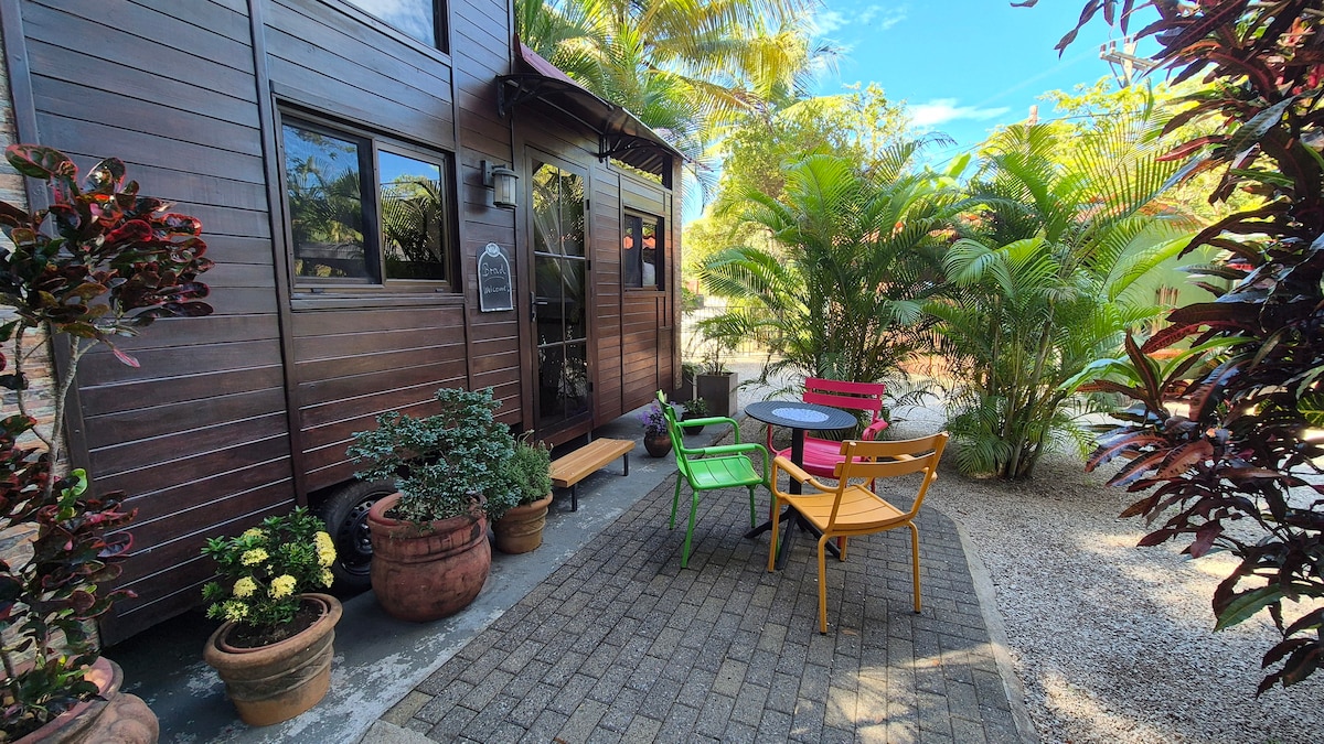 An artistic and private beach house. This one bedroom house is perfect for a couple or even a small family of 3. Short walk along shaded path to the surf. Open, spacious and light with your own private tropical outdoor shower, hammock off your personal patio and BBQ along outside dining. Lush garden with complete privacy. Huge property. Mature trees and abundant with birds and wildlife. Very peaceful retreat.