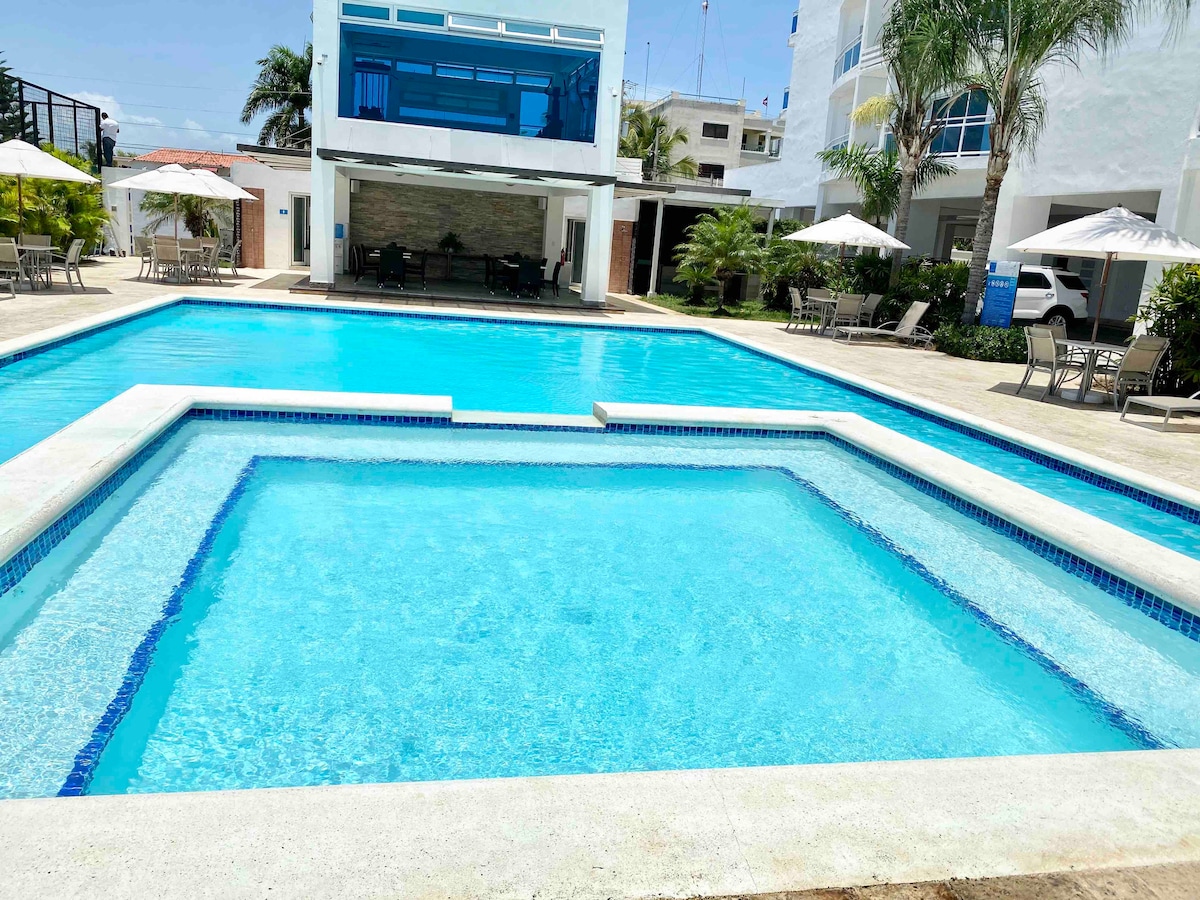 Disfruta de esta relajante experiencia en nuestro apartamento frente al mar, rodeado de amplios espacios de recreación y tranquilidad, este apto es el lugar perfecto para quienes bucan comodidad y belleza en su próximo destino frente al mar. Podrás tener acceso a la playa de Juan Dolió a 5 min caminando. Áreas comunes: • Piscina • Jacuzzi • Lobby • Gazebo • Cancha de voleibol A 10-15 minutos en coche del Malecón, Jumbo, el estadio de béisbol Tetelo Vargas y la Zona Franca.