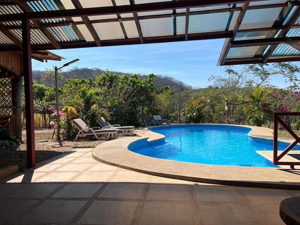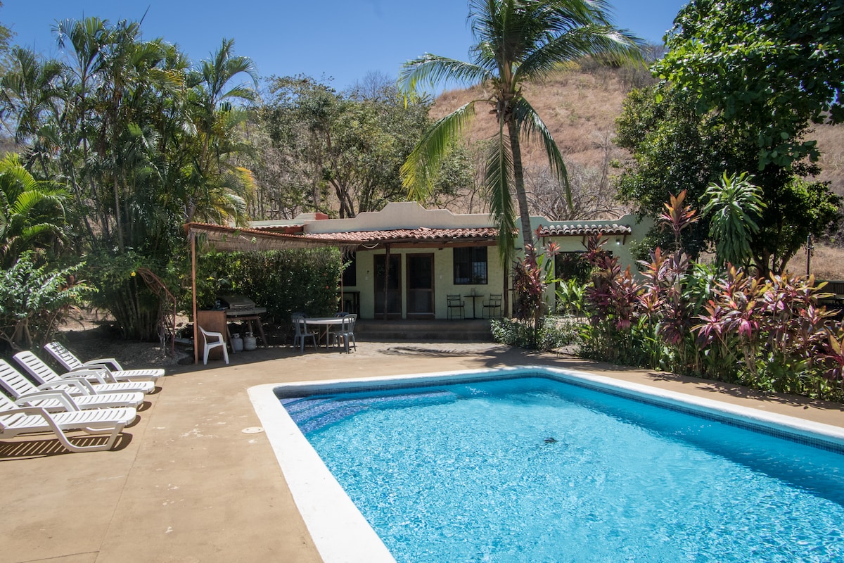 NEWLY RENOVATED Charming "Sol y Luna" 3 BDR house WITH PRIVATE POOL, walk to beach. Located in a 60 acres organic farm secure with a 24h guard. 3 bedrooms with A/C and fans. Horse ride available on property. WIFI internet in the entire house. Large patio. Comfortable& fully equipped kitchen. Separate and private laundry. 5 mn drive to surfing spot of Playa Negra and to playa Avellanas, walking distance to Playa Lagartillo. 25 min drive to Tamarindo.