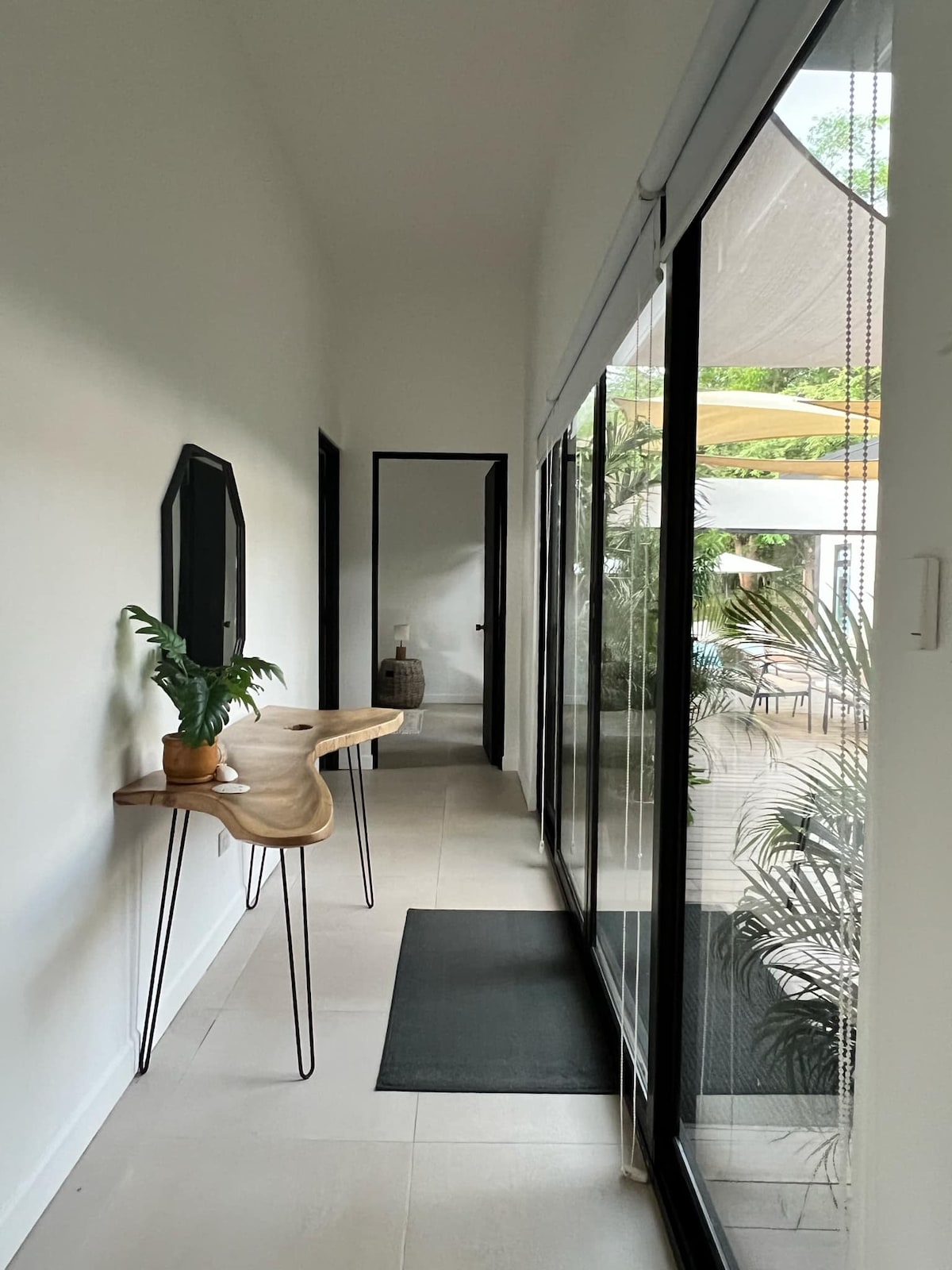 Large and luxurious suite with modern accents with walls of glass and views overlooking the lush valley and a glimpse of ocean views. Featuring a private terrace, adjacent the shared pool. Enjoy a piece of paradise and yet close to services. 15 min walk to the beach( 1 min drive), restaurants and groceries. High speed Fibre optic wi fi . This is a private gated estate with the main house above and 2 suites on the ground floor. Life is easy at this unique and tranquil getaway.