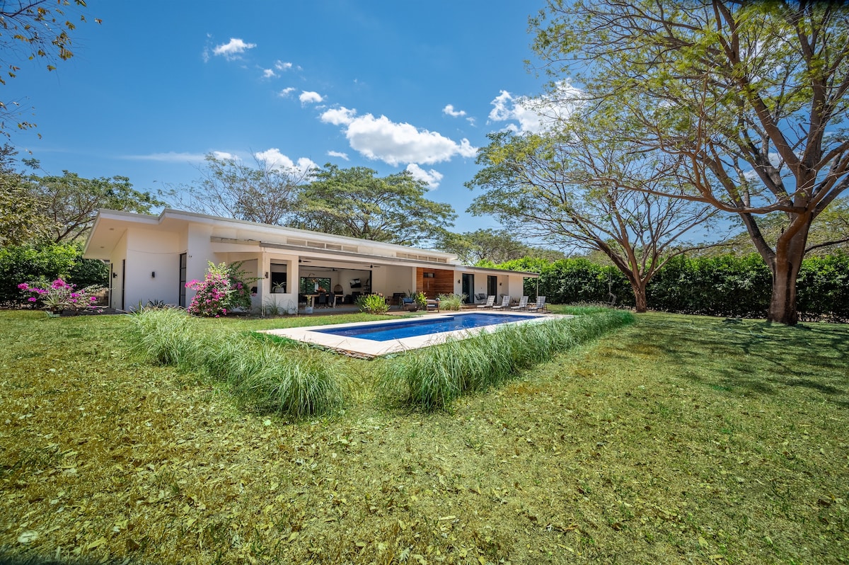 NEWLY RENOVATED Charming "Sol y Luna" 3 BDR house WITH PRIVATE POOL, walk to beach. Located in a 60 acres organic farm secure with a 24h guard. 3 bedrooms with A/C and fans. Horse ride available on property. WIFI internet in the entire house. Large patio. Comfortable& fully equipped kitchen. Separate and private laundry. 5 mn drive to surfing spot of Playa Negra and to playa Avellanas, walking distance to Playa Lagartillo. 25 min drive to Tamarindo.