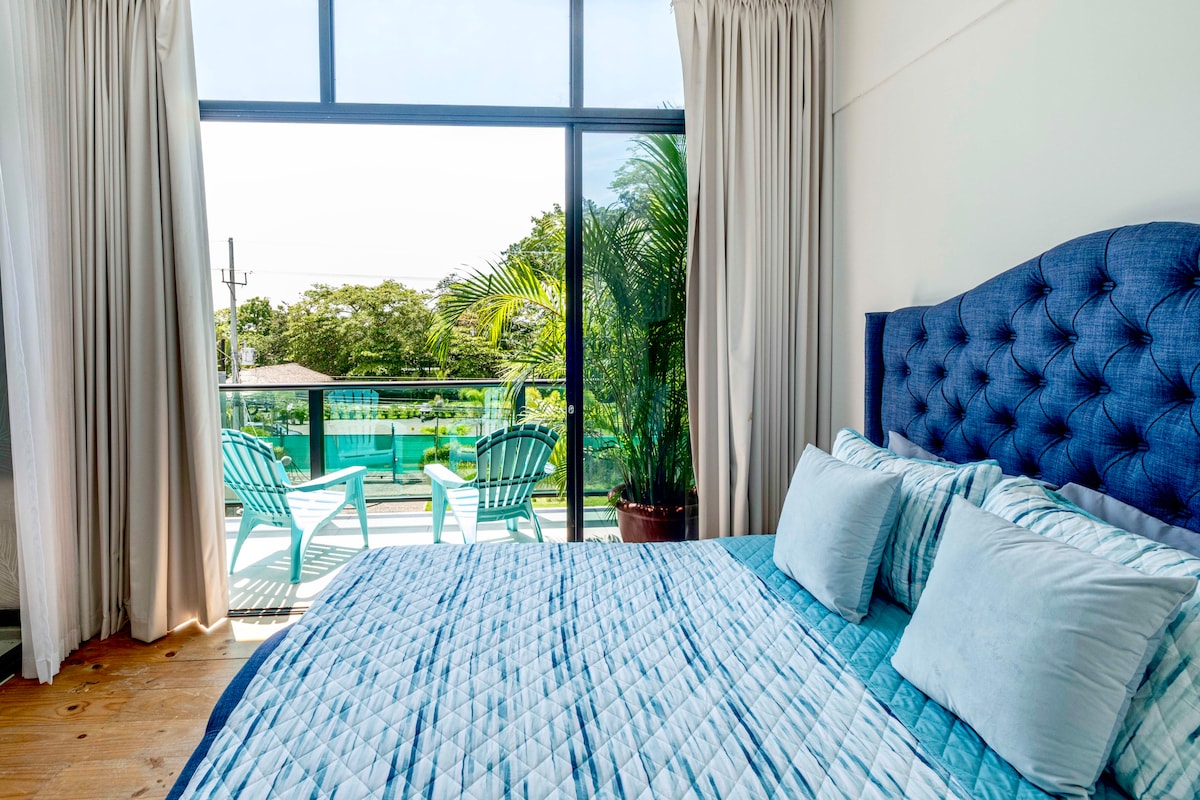 Best location in the heart of Jaco. Enjoy ocean views from your awesome king size bed in a 2024 built, oceanfront studio on the beach, 1 block away from the main Jaco strip. Walk to everywhere! This complete private romantic studio, on 8 th floor has its own entry door, its own intimate balcony with boasting Ocean views, mountains & city. Securely gated, 2 pools, gym, co working area, barbecue area and an incredible 13 th top floor sunset deck with 360 degree views. Pura vida!