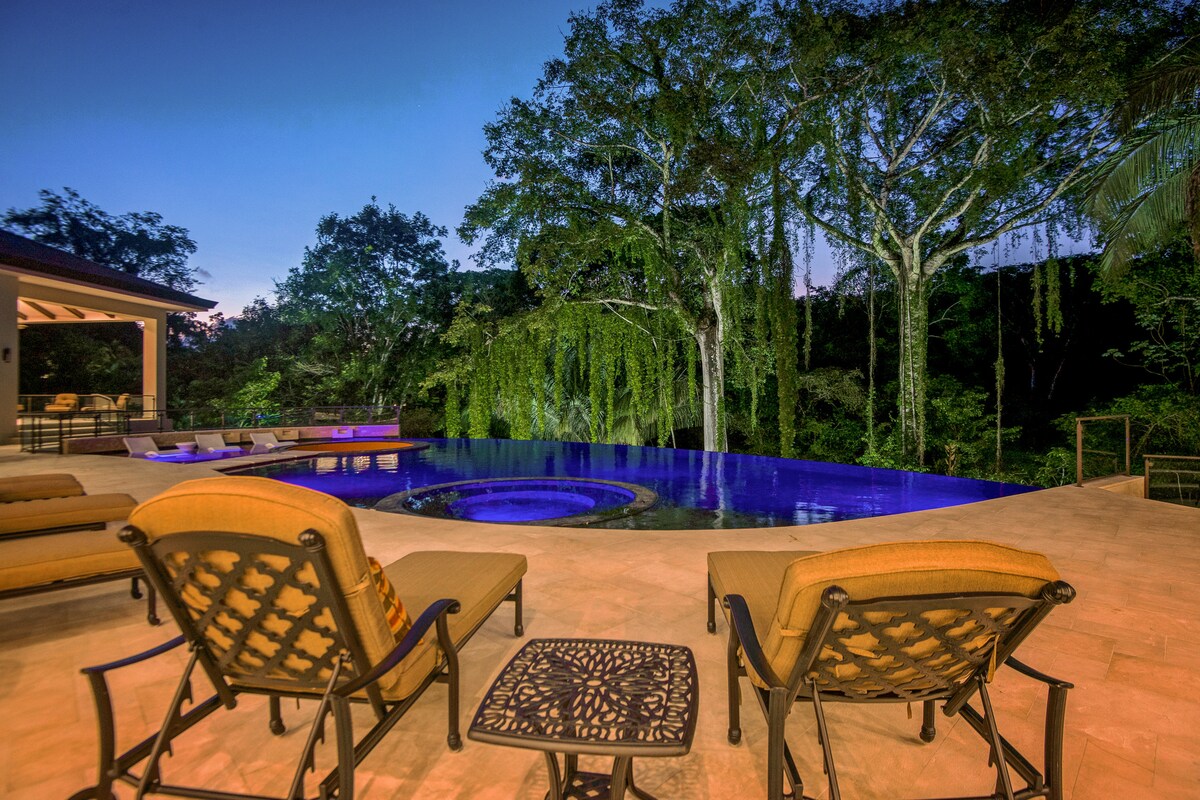 Make monkeys, sloths and toucans your closest neighbors at Casa Vista Paraiso. Nestled into the lush forest like a house in a fairy tale, this luxury Costa Rica vacation rental is the ultimate private retreat. But that doesn’t mean it’s isolated—it’s on the grounds of the Los Sueños Resort, so the fairways, beach club, marina and more are just a short golf-cart ride away from your haven. This secluded villa opens to a spacious terrace with a sunny row of loungers, pool and hot tub, all with views of the jungle so you can listen to the birds call or spot colorful dragonflies and butterflies while relaxing. A covered outdoor kitchen has a sitting area where you can serve refreshments from the bar while waiting for the barbecue to heat up, and al-fresco dining for eight. For indoor entertaining, there’s a wine fridge, wet bar and sound system. One of the most spectacular homes on the resort, Casa Vista Paraiso takes its inspiration—and many of its materials—from grand Italian estates. The nearly 9,000 square feet of custom-designed living space boast gorgeous marble floors, leather sofas, wrought-iron chandeliers and a comfortable mix of wood and wicker furniture. The living room, formal dining room and fully equipped kitchen with breakfast bar wrap around the terrace and open to it through several sets of glass doors. Each of the villa’s five bedrooms has an en-suite bathroom, making the property a wonderful alternative to a resort for a family or group of friends traveling together. There are four bedrooms with king beds, including two master suites with balconies, and one with two queen beds. Your holiday includes access to the shared beach club, restaurants, bars and marina at Los Sueños Resort, as well as the golf course upon request. Nearby sights include Playa Herradura, where you can book a fishing expedition or surf lesson, and Playa Jaco, also home to great waves and plenty of scarlet macaws. Ask resort staff about activities like waterfall tours, ATV rides, ziplining and stand-up paddleboarding, which are popular with everyone from couples on honeymoon to families to retirees. Copyright © Luxury Retreats. All rights reserved. BEDROOM & BATHROOM • Bedroom 1 - Primary: King size bed, Ensuite bathroom with stand-alone shower, Rain Shower, Dual Vanity, Walk-in Closet, Television, Air conditioning, Ceiling fan, Balcony, Safe, Desk, Direct access to Pool • Bedroom 2: 2 Queen size beds, Ensuite bathroom with stand-alone shower, Walk-in Closet, Television, Air conditioning, Ceiling fan, Safe • Bedroom 3: King size bed, Ensuite bathroom with stand-alone shower, Dual Vanity, Walk-in Closet, Television, Air conditioning, Ceiling fan, Balcony, Safe, Desk, View of Rainforest • Bedroom 4: King size bed, Ensuite bathroom with stand-alone shower, Walk-in Closet, Television, Air conditioning, Ceiling fan, Safe • Bedroom 5: King size bed, Ensuite bathroom with stand-alone shower, Air conditioning, Ceiling fan, Balcony, Safe, Desk FEATURES & AMENITIES • Wine fridge • Wet bar OUTDOOR FEATURES • View of the jungle • Security cameras - outward facing SHARED ACCESS TO THE LOS SUENOS RESORT AMENITIES • Los Suenos Golf Course (at additional cost, advanced notice may be required) • Los Suenos Beach Club • Los Suenos Marina • On-site Restaurants and Bars STAFF & SERVICES Included: • Access to Los Suenos Private Beach Club Extra cost (advance notice may be required): • Golf cart rental