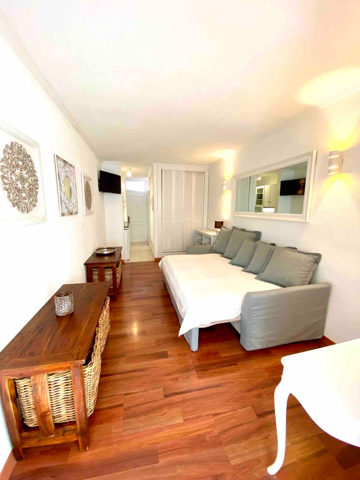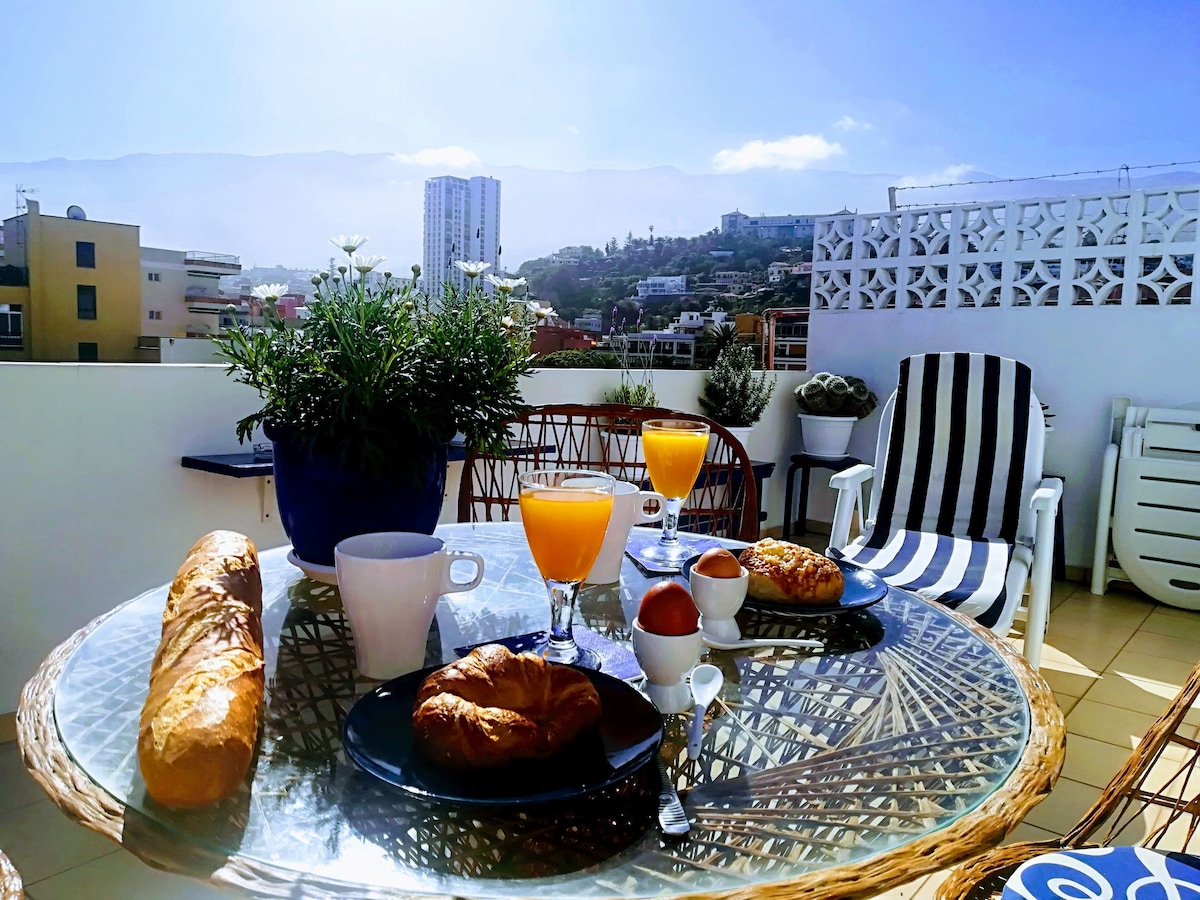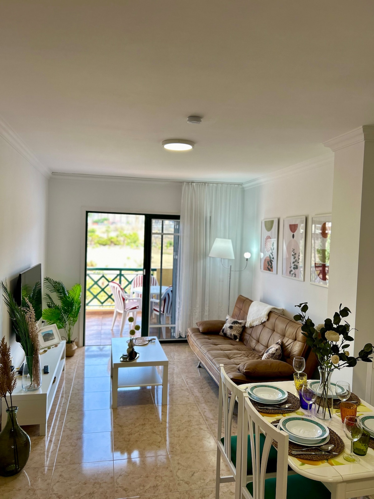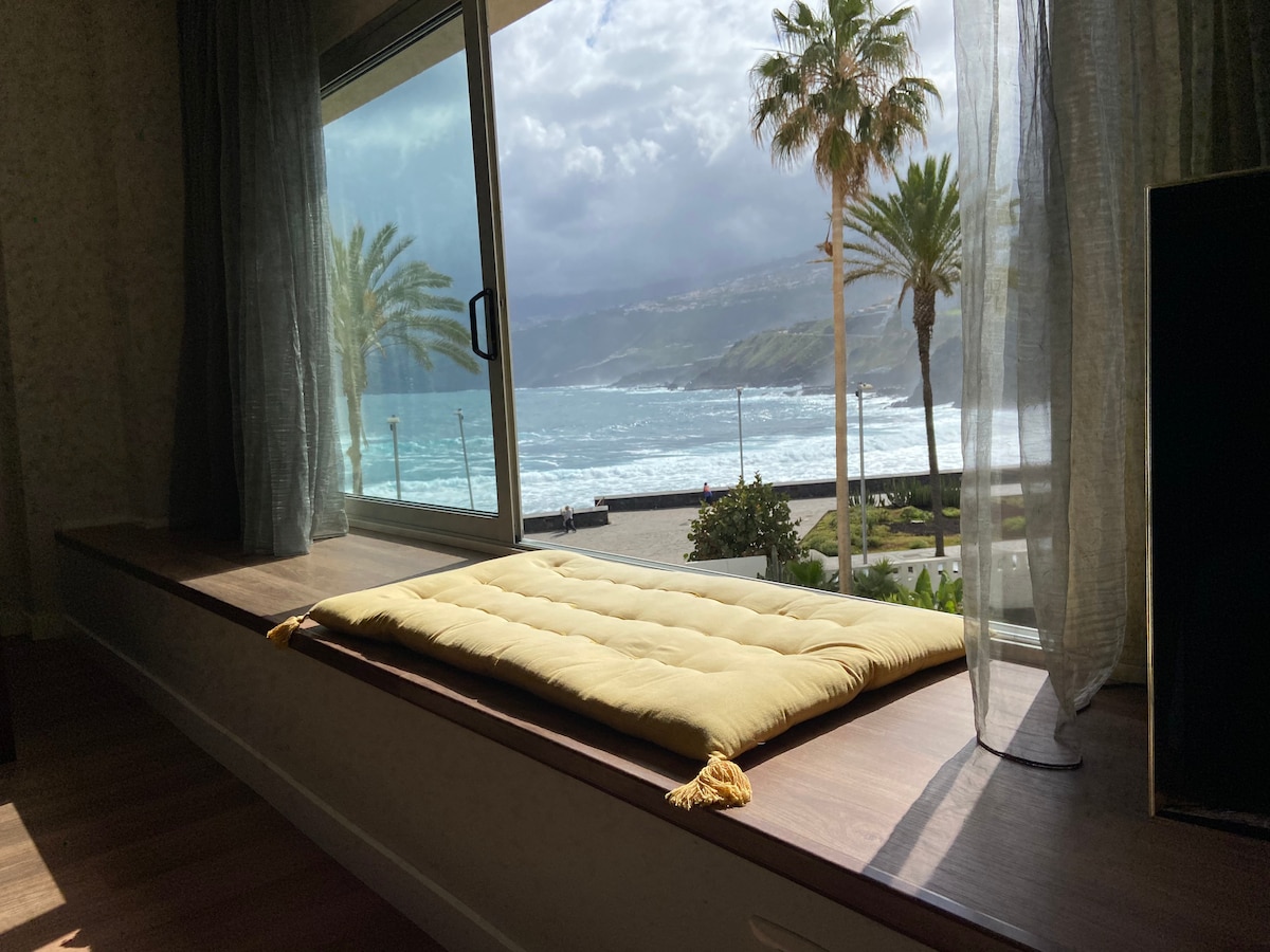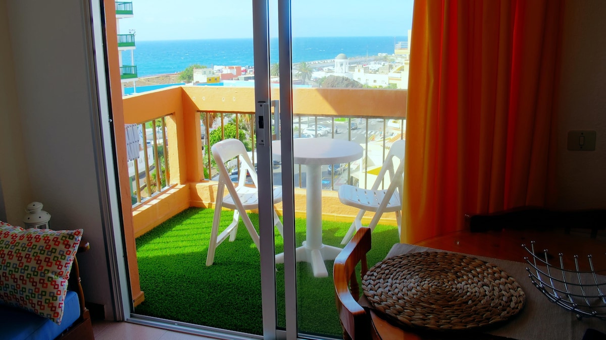 Tropical inspired décor, very bright and modern vacational rental in a 8th floor. Literally within 30 seconds from the beach. In line with a magnificent ocean view as well as a splendid view of Teide volcano from a furnished balcony terrace. A wonderful studio with 1 double bed and 1 sofa-bed. Washing machine, fiber optic wifi network (600Mbps).Close to all amenities including 24h concierge service at hall, tennis court,2 high rise pool solarium,1 big pool,outdoor gym.