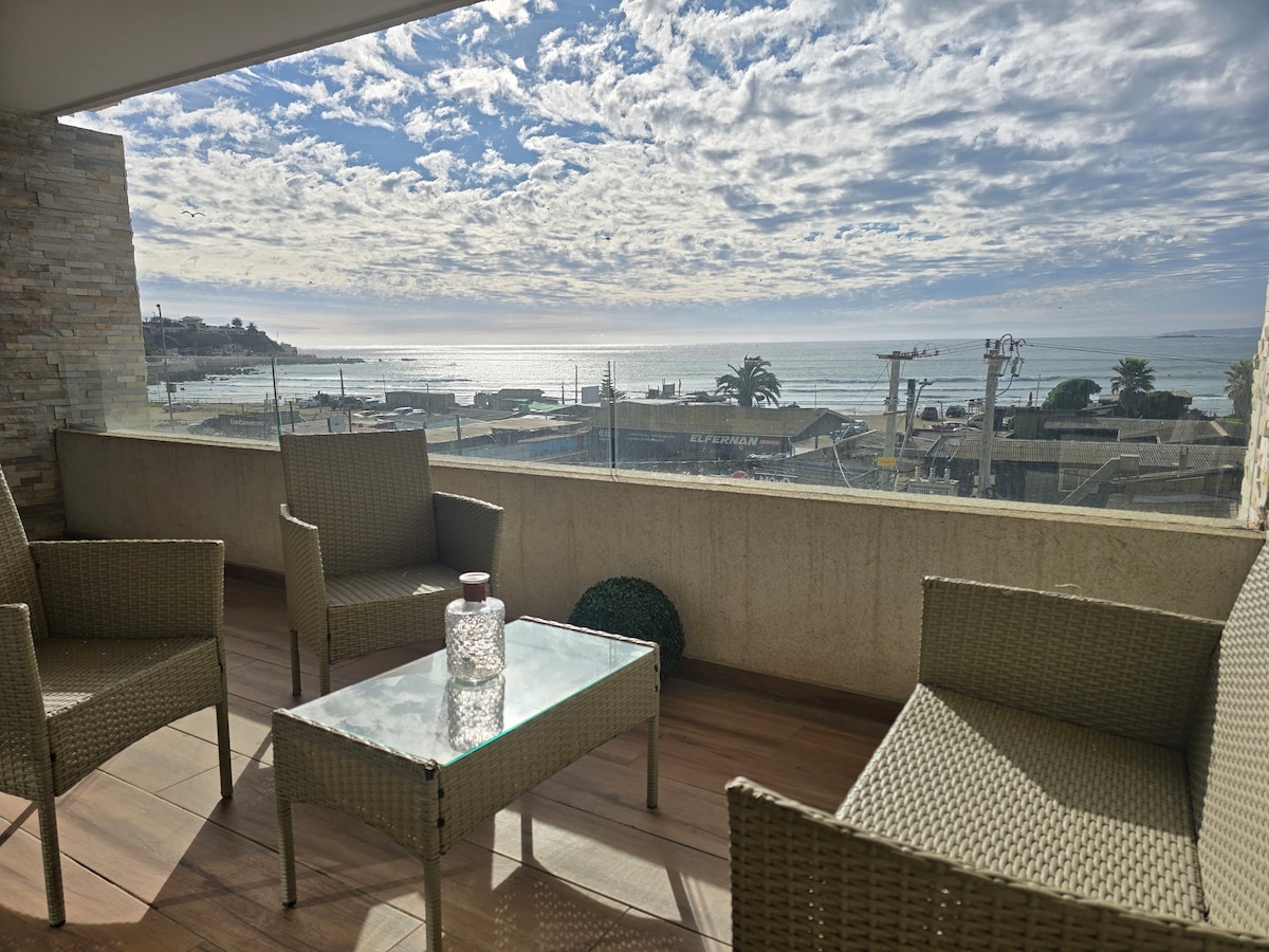 Welcome to "Oasis Costero" A new, fully equipped apartment on the waterfront with an ocean view in Concón. - Outdoor pool available between November and March. - Private parking. - Spacious terrace with ocean view equipped with an electric grill. - Includes bed linens and towels. - WiFi, and a Smart TV. - Fully equipped kitchen. - Safe and quiet area. - Just steps away from Beaches, Restaurants and Bike Paths.
