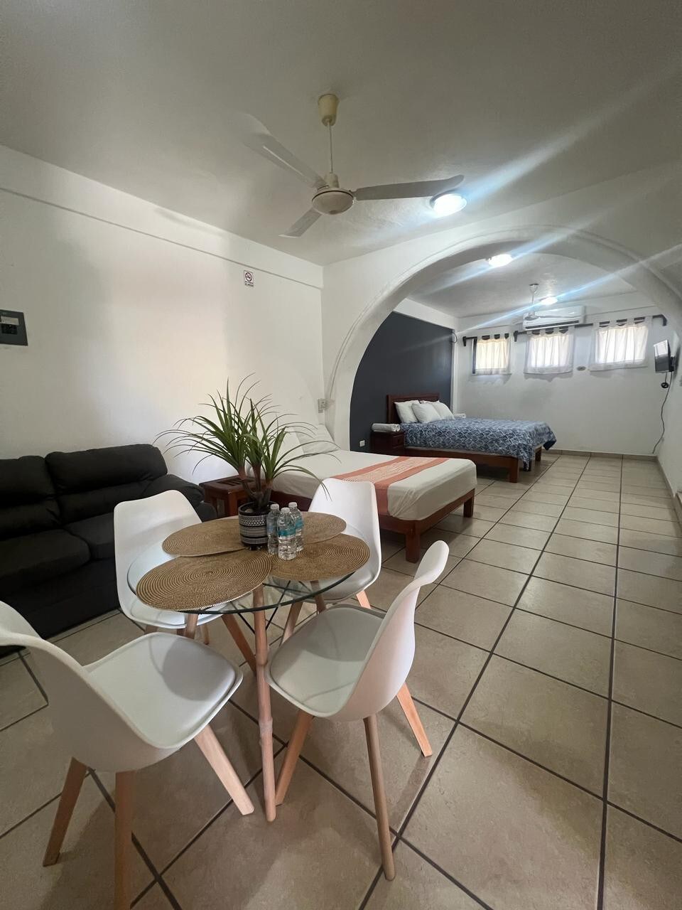 Acogedora y con todo lo esencial, la Habitación palma compacta es perfecta para quienes buscan comodidad en un espacio íntimo. Cuenta con cama king size, aire acondicionado, TV por cable, WiFi, y baño completo. Su pequeña terraza es ideal para leer o tomar un café. Ideal para parejas o viajeros que valoran la tranquilidad, el confort y un ambiente cálido y encantador.