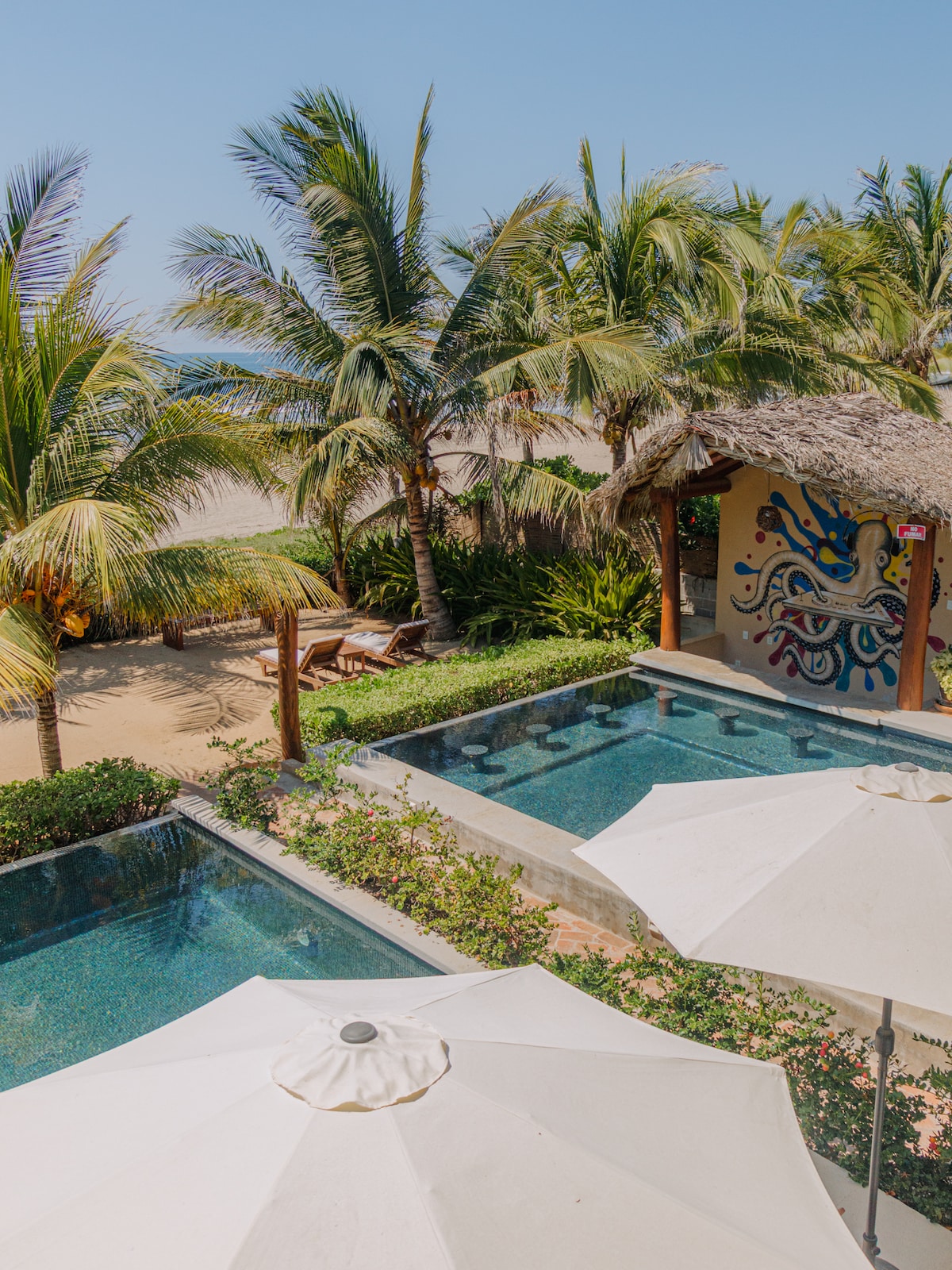 Casa Hermoso Cariño: Mercer Bungalow Ask about the adjoining Madrona Bungalow! These charming, high-end beachfront bungalows are in the heart of Troncones—just steps from shops, restaurants, and bars. This 8-plex offers essential amenities to make any traveler feel at home in paradise. Inquire about renting the entire property—accommodates up to 26 guests! The 8 bungalows at Hermoso Cariño offer the perfect stay to experience the vibrant energy of Troncones.