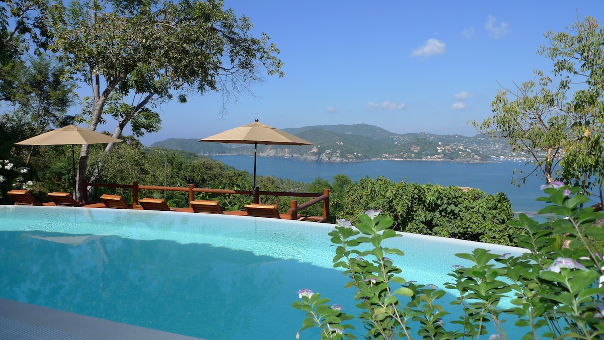 Breath taking panoramic views of the bay of Zihuatanejo from all (URL HIDDEN) above Playa La Ropa.Fully equipped kitchen,TV/VCR,local phone,internet speed 155 ,king bed, A/C in bed room,easy walk to the beach and taxis there to go back.There are stairs from the street.Maid service and you can arrange for some meals to be prepared for you and some shopping prior to your arrival. We also have a driver available if you would like but the house has a local phone that you can use to call for a taxi.