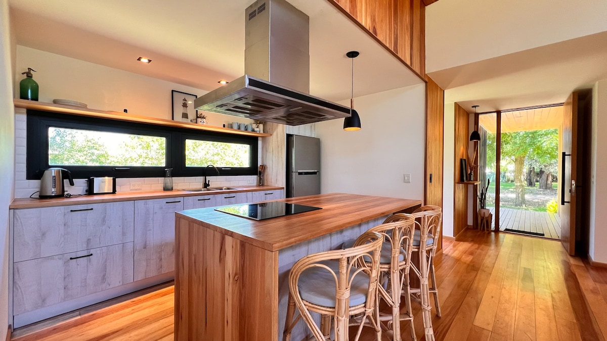 Vivi el campo y el mar a 400 metros de la playa Cruz del Sur. Disfrutá de un entorno natural y relajante. Se trata de una casa modular que construimos para disfrutar en familia y que decidimos alquilar en épocas de año en las que no la usamos. Posee un dormitorio con cama matrimonial que puede transformarse en 2 singles, una cocina totalmente equipada y un living con sillones y salamandra para la cual dejamos leña disponible. En el dormitorio hay una estufa. Cuenta con servicio de wifi.