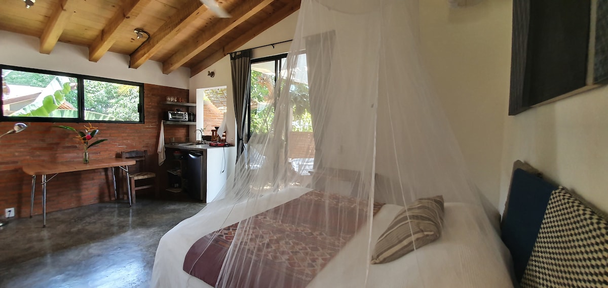 If you like nature Casa Miraflores is the right place for you. The house is located 5 min from town in a quiet area. You will find Colibries, chachalacas and lots of beautiful butterflies. Enjoy the open concept and outdoor lounge area with pool. Have your breakfast on the terrace before you head to the beach. The house has a king size bed with mosquito net in the first bedroom and queen size bed with mosquito net in the loft under the palapa. Bathroom with walk in shower.