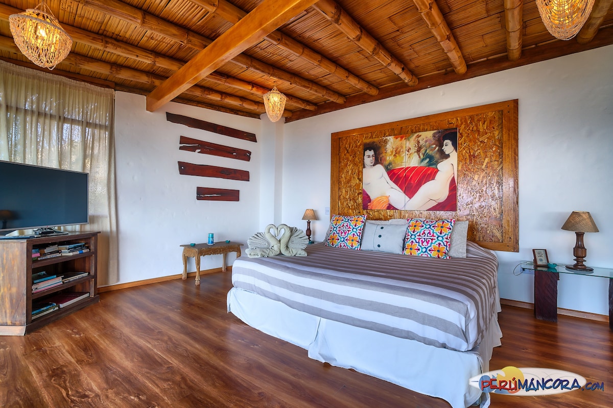 Duplex ideal para parejas con una excelente espectacular vista y terraza al Mar. Ideal para personas deportivas que gustan subir escaleras. Totalmente independiente, amoblado y equipado. A 3 minutos caminando a la playa Las Pocitas y a 3 klm del pueblo de Mancora.