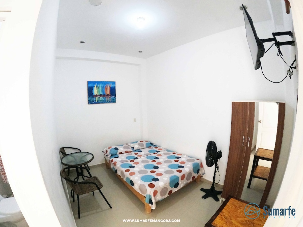 -Habitación de Hotel (12 m2),ubicado a 100mts o una cuadra de la playa en el centro de Máncora.- 01 Cama de 2 plazas, baño privado, ubicado en el primer piso.-Ventilador de pie, tiene su armario mediano con un colgador, mesas de noche , ventana con malla de mosquetero para evitar la entrada de insectos a su habitación y tiene vista al jardín y a la piscina del hotel, -no tiene vista a la playa.-no agua caliente.-puede haber bulla de afuera.