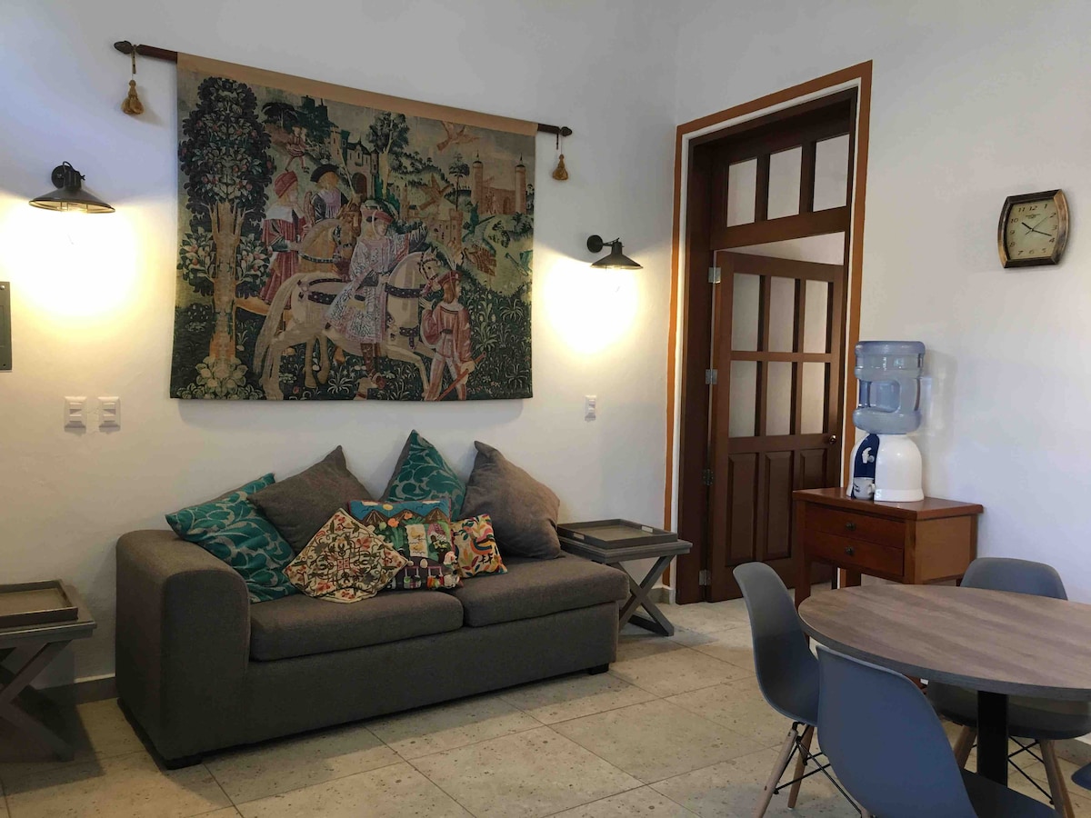 Cozy apartment full of natural light in the heart of Mazatlan, one block away from the city's cathedral and plazuela machado, surrounded with restaurants, bars, convenience stores and even the iconic Angela Peralta Theatre. The apartment is located in a first flor with no elevator access, the street where the apartment is located is small and very quiet most of the day. If you walk for 5 minutes you will arrive to the beach, Olas Altas.