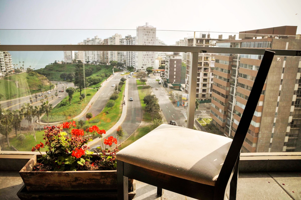 Explore the city of Lima, from our cozzy mini apartment, with and exclusive location beetween the most turistic districts and accesible avenues in Lima. An spectacular view to the sea from the terrace, a couple of blocks away from the pier and really close to restaurants, bars, turistic places and a lot of entertaining options. It’s building with 24/7 frontdesk , it has a private parking and common areas like outdoor pool, gym, laundry room.